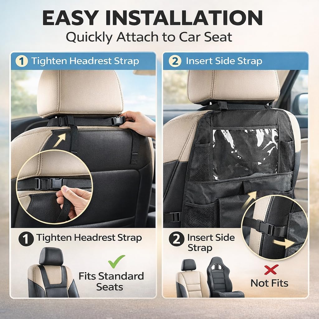 【12″ TOUCH SCREEN TABLET HOLDER FOR CAR】 Engineered with an upgraded clear TPU window, this car backseat organizer fits large devices up to 12.9″ (compatible with iPad Pro/Air, Galaxy Tabs). Unlike blurry PVC pockets, our sensitive touch screen tablet holder ensures HD viewing for cartoons, keeping toddlers quiet and entertained. The ultimate baby travel essential for peaceful drives.