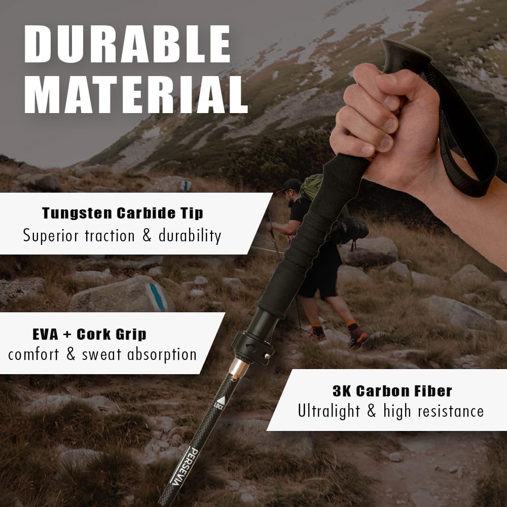 Conquer more miles with less effort. Persevia carbon fiber trekking poles deliver stability, comfort and durability on every trail. At approx. 7 oz per pole, the 100% 3K carbon fiber shafts reduce fatigue while maintaining outstanding strength and natural shock damping. Adjustable 24″-54″ with metal FlexLock flip-locks that hold your set length secure – no twist-lock failures. Tungsten-carbide tips grip dirt, rock and ice. Tri-fold collapsible design packs small for travel and stores easily in the included quiver-style case. Ergonomic cork grips with EVA extension and padded adjustable straps provide sweat-wicking, blister-free comfort. All-terrain kit included: rubber tips, boot tips, mud baskets and snow baskets. Ready for hiking, trekking, backpacking or everyday walking. Built to last and backed by Persevia support.