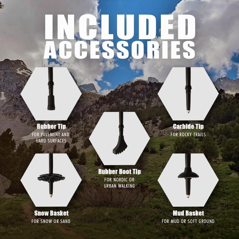 All-Terrain Accessories Included – Complete kit: rubber tips, boot tips, mud baskets and snow baskets – swap in seconds to protect tips and maximize traction in any season.