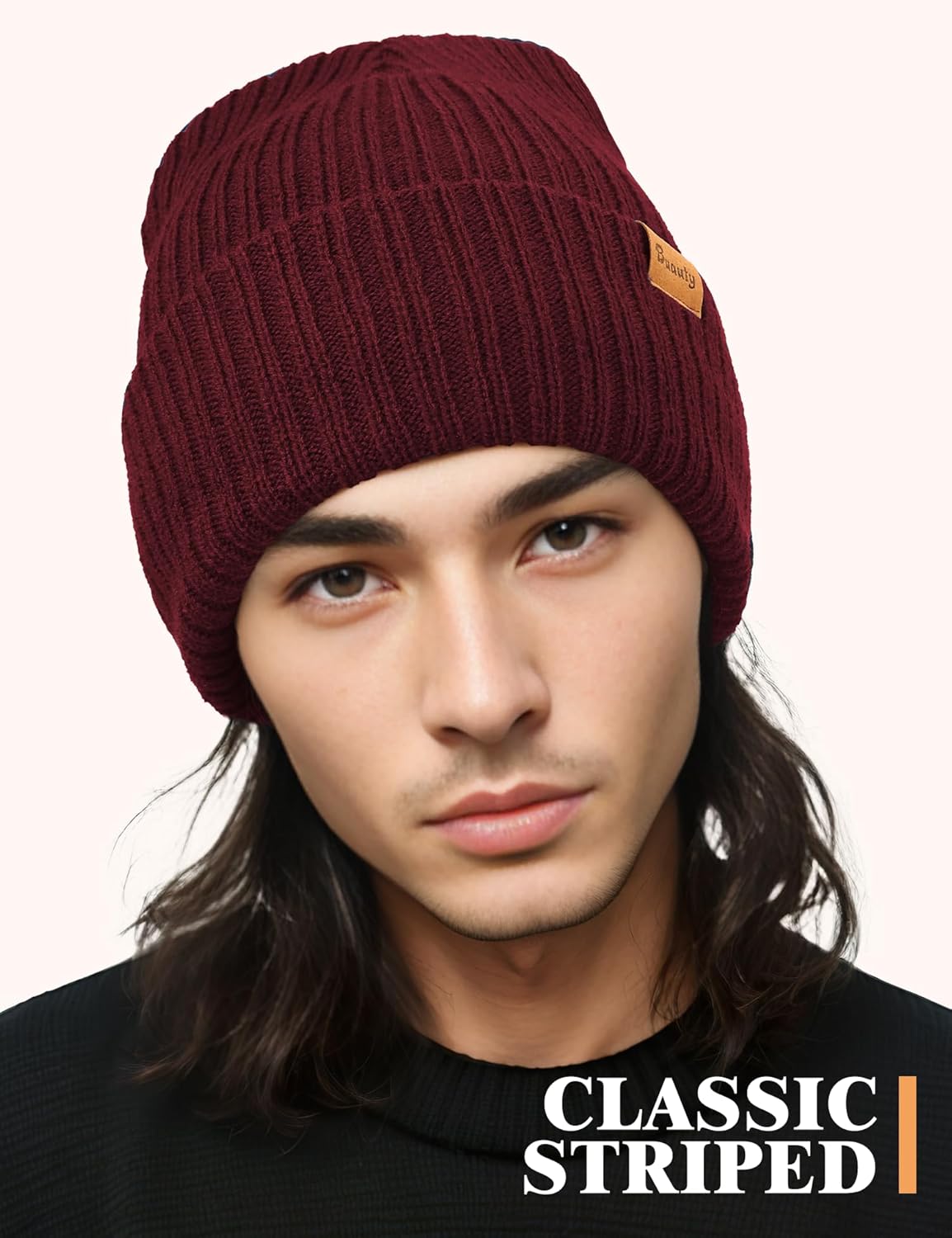 This beanie features a classic vertical stripe knitting pattern that is simple and stylish for both men and women.