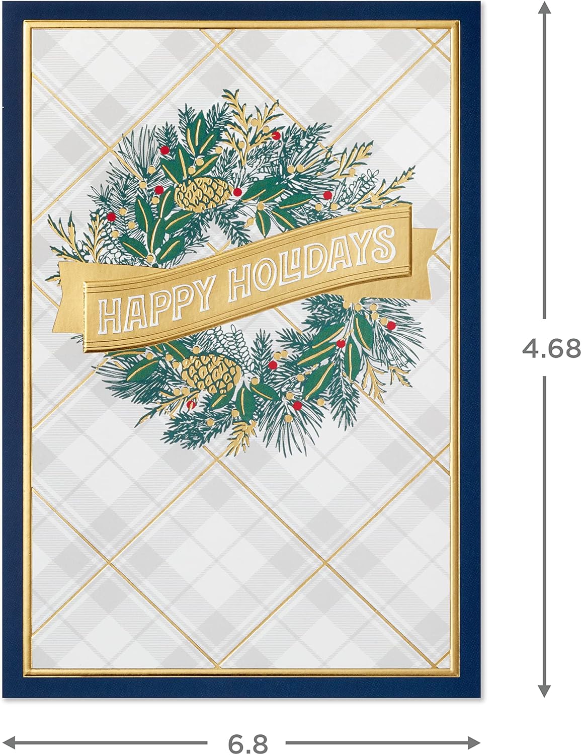 Holiday cards feature four unique designs, accented with foil. Inside message for each design: Wreath design reads, “Hope your season is filled with all the things that make this time of year really special for you;” ornaments design, “‘Tis the season to remember all the good things . . . love and family, friendship and laughter, and, of course, people like you;” snowflakes design, “Hoping all is calm and all is right with your holidays;” tree design, “Remembering you warmly this holiday season and wishing you all the merriest.”