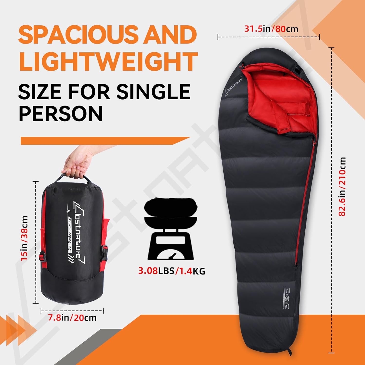 LIGHTWEIGHT and PORTABLE: The light sleeping bag with dimensions of 82.6” x 31.5”(210cm x 80cm) when in use and a packed size so small of 15” x 7.8”(38cm x 20cm), weighs only 3.08 lbs (1400g). Designed for adventurers on the travel, our Cold Weather sleeping bag is incredibly lightweight and packs down efficiently, making it easy to carry in your backpack. In addition to the storage bag, we also provide a large mesh bag for easier carrying