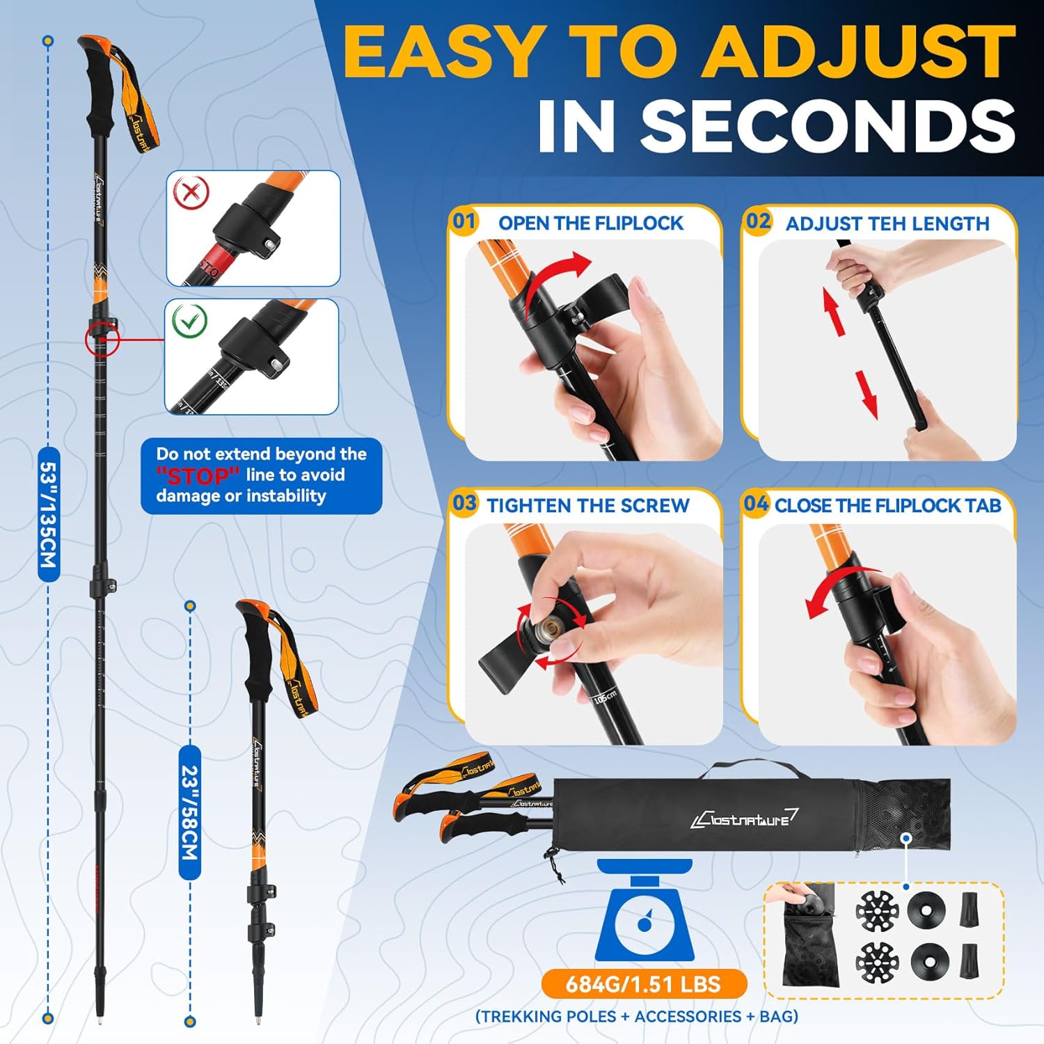 SECURE QUICK-ADJUST: Clostnature hiking poles are telescopic, with an adjustable range from 23”/58cm to 53”/135cm, perfect for fitting everyone in the family or switching between terrains. They feature easy-to-use quick-flip locks, with no messy parts or confusing knobs: just open the flip-lock tab to unlock, adjust to your ideal length, close the tab, and you’re ready in seconds. For safety: Do not extend beyond the “STOP” line, as this prevents damage and avoids instability