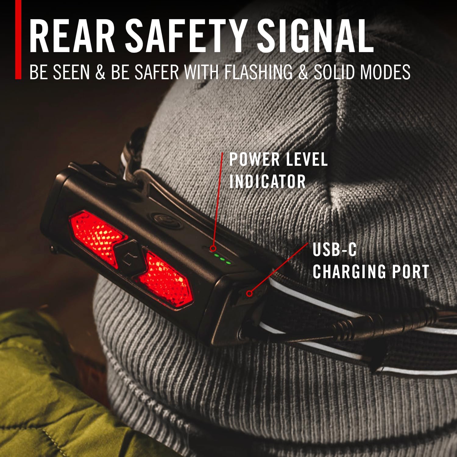 REAR-FACING SAFETY LIGHT: Make yourself visible to those behind you with an independently controlled safety light—shining solid red or flashing red—built into the battery housing at the rear of the head strap.