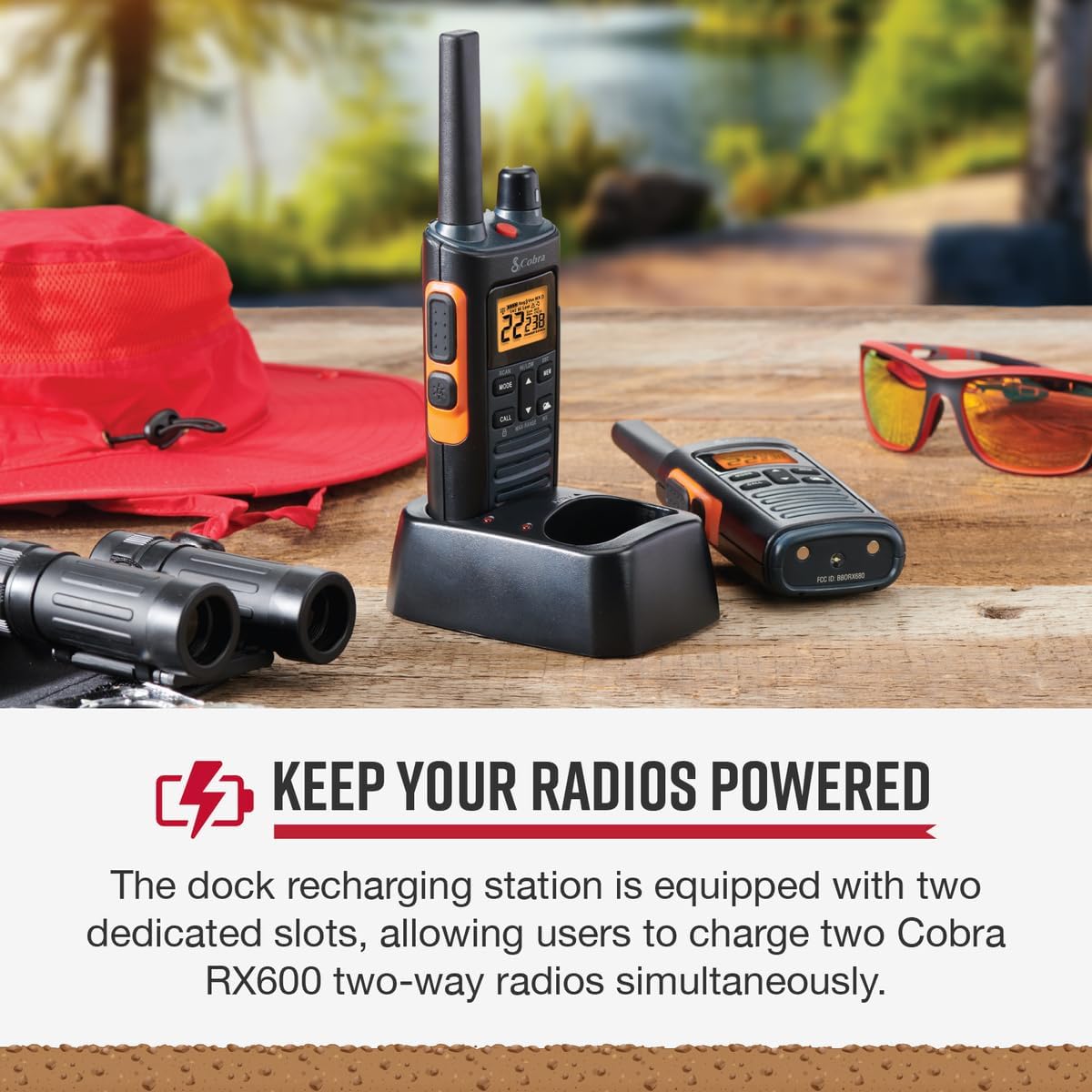 Dual Charging Slots – The dock recharging station is equipped with two dedicated slots, allowing users to charge two Cobra RX walkie talkies simultaneously, ensuring that all devices are charged and ready for use at any time.
