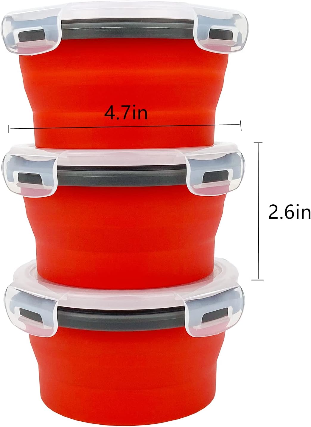 COLLAPSIBLE FOR SPACE SAVING: Round silicone food containers can be collapsed to half of their original height for maximum space spaving. The collapsible silicone containers take up no space in your pocket, backpack, suitcase. And it also fits into almost all kitchen freezer/pantry compartments or any cabinets.