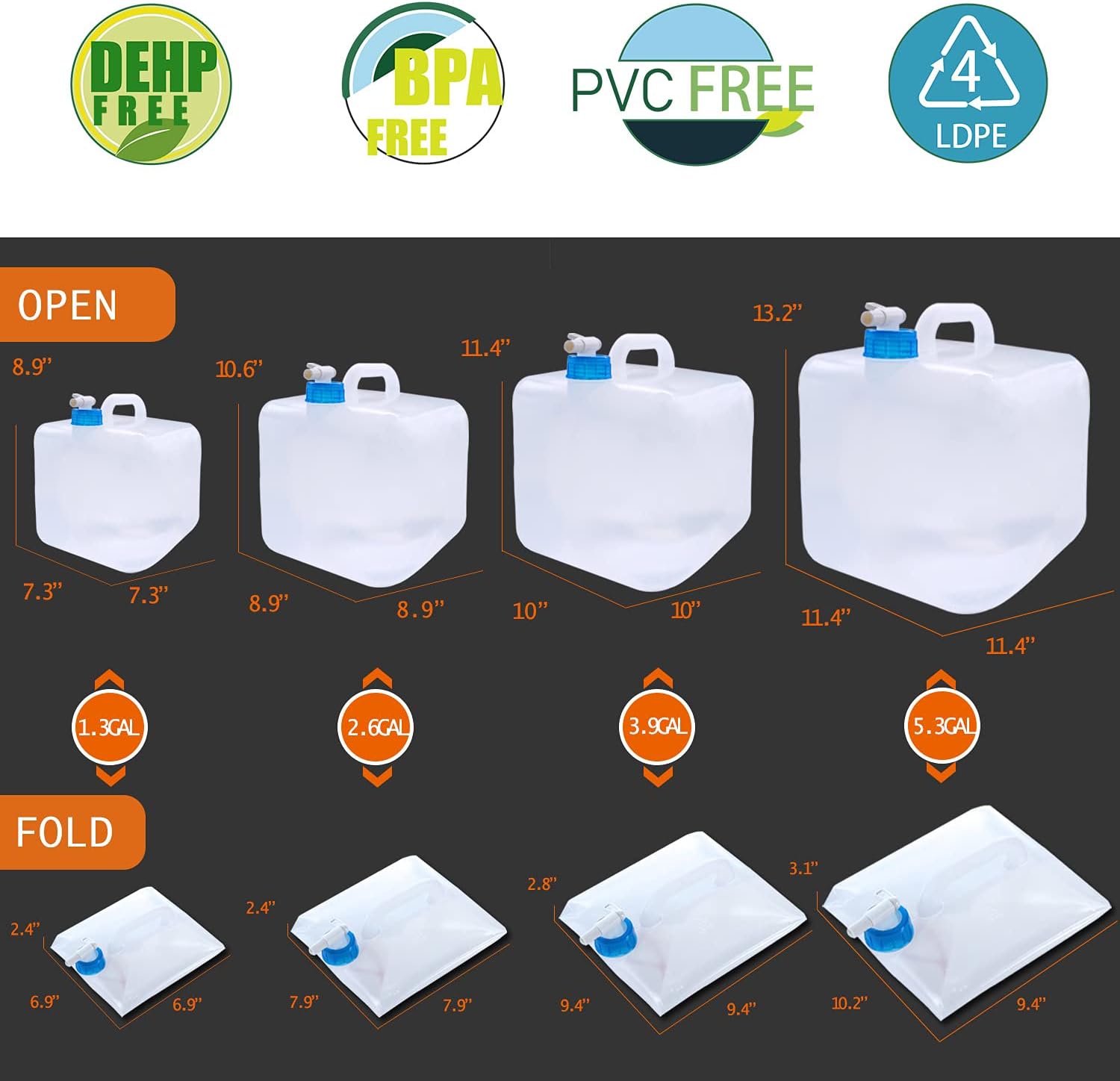 Outdoor, Emergency&Daily Use: Collapsible water container, suitable for outdoor activities, like backpacking, camping, hiking, climbing, hunting, can help you to store all the water your family needs quickly and safely during in the event of an emergency or natural disaster like hurricane, tornado, earthquake, fire, flood or drought. Also great for daily use, such as automobile emergency water & Hand-washing stations at events and festivals. Transport large amounts of water easily.