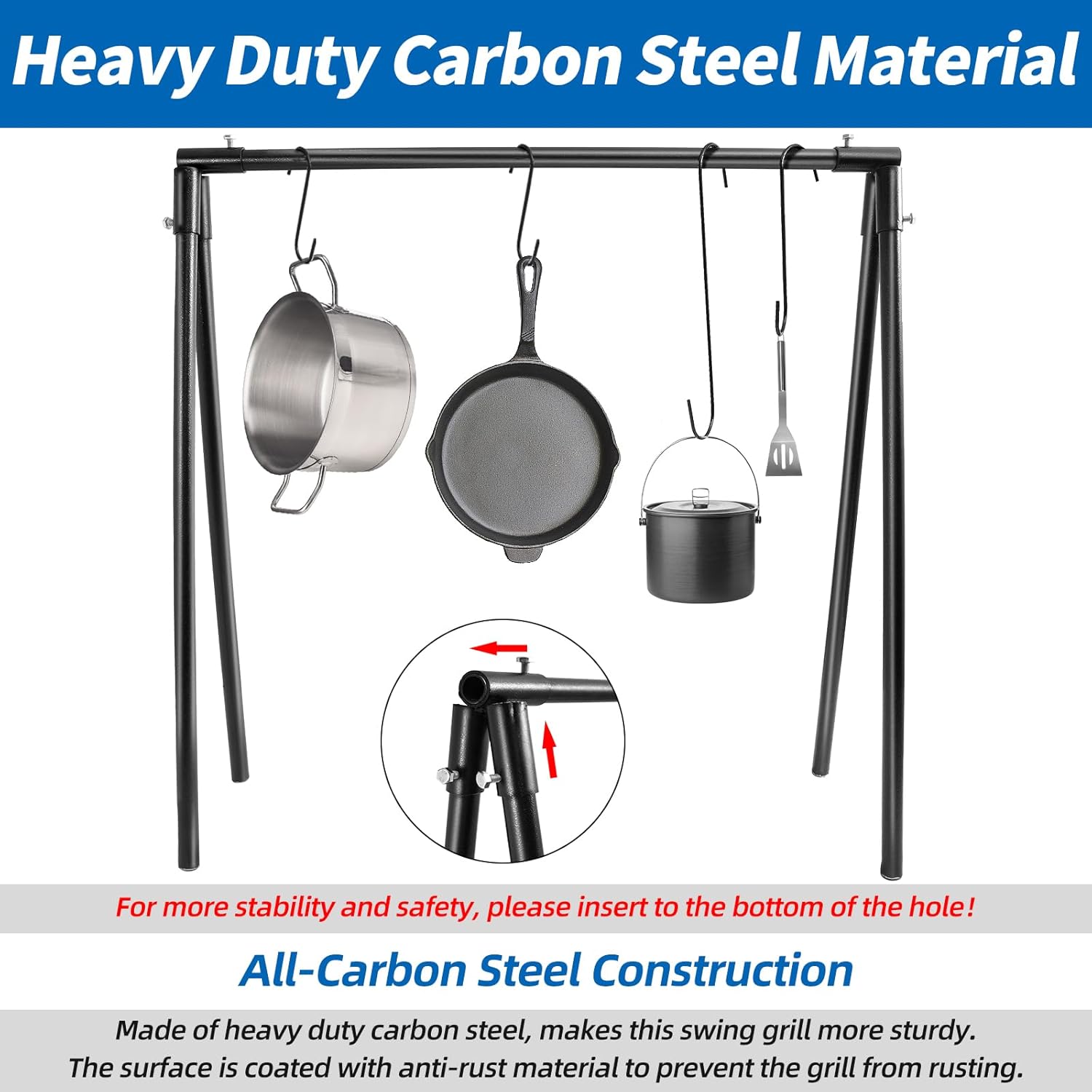 [All Carbon Steel Material]-Our campfire swing cooking grill stand is made of heavy duty carbon steel, covered with anti rust material, makes it more durable and sturdy, high temperature resistant, can be directly used in campfire.