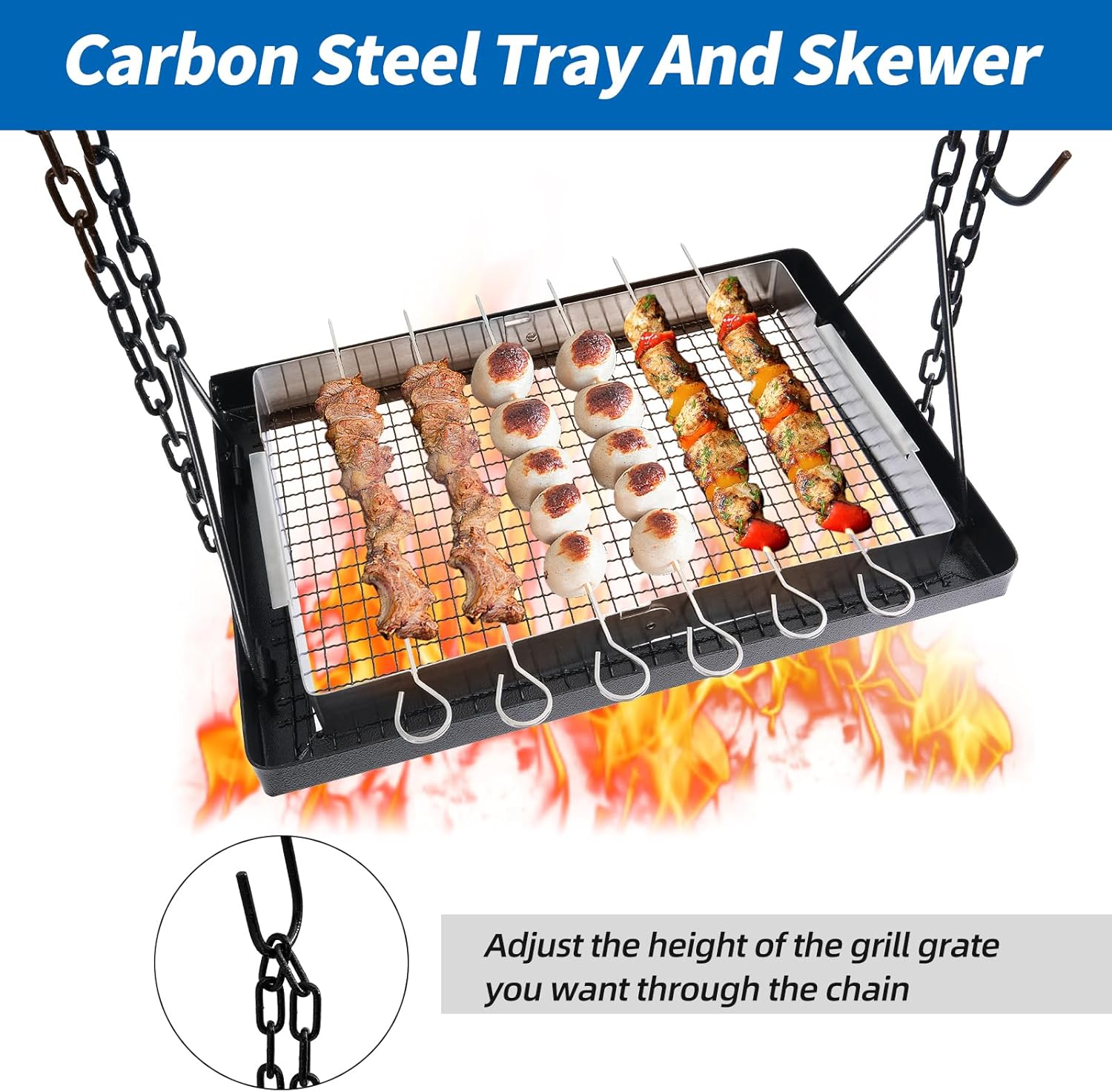 [Size]-The size of the campfire is 34 X 34inches, the grill grate size is 16 X 11.2inches/ 40.5 X 28.5. There are longer rods available for hanging, allowing you to use more cooking utensils at the same time, improving efficiency and freeing up your hands.