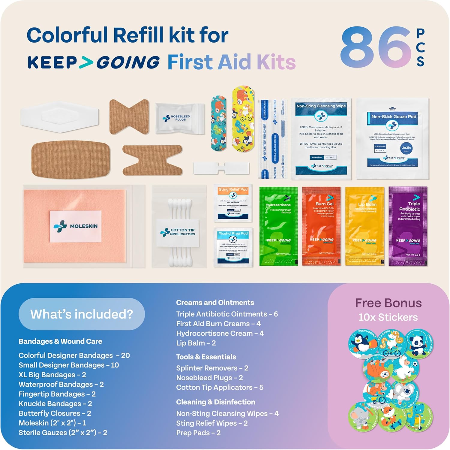 86-Piece Refill Pack – Essential first aid supplies to restock your KeepGoing kids first aid kit.