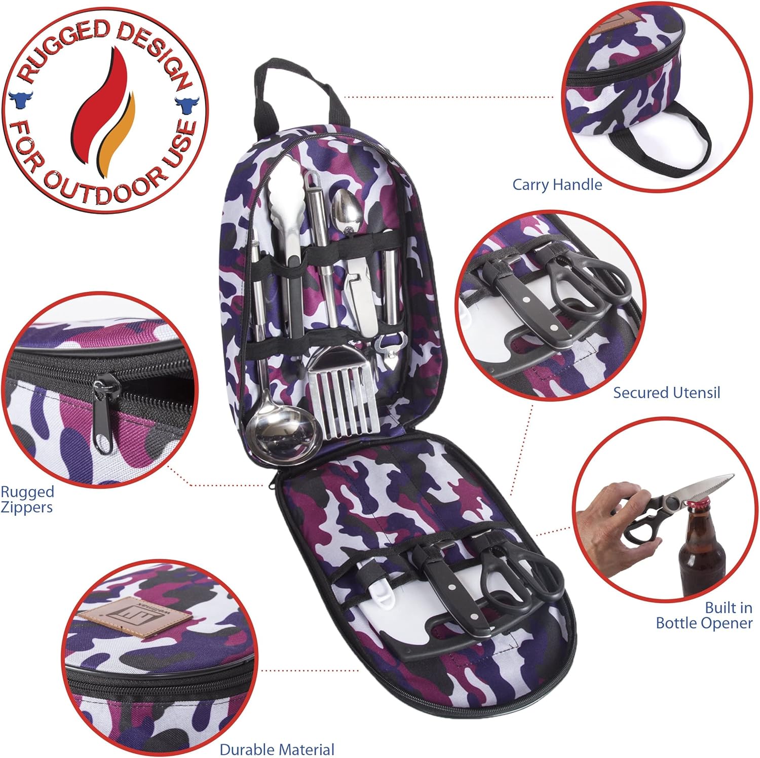 【Rust-Resistant Stainless Steel】 Heavy-duty, dishwasher-safe tools withstand outdoor elements, sharp objects, and frequent use. Protective casing prevents scratches and keeps utensils secure during transport