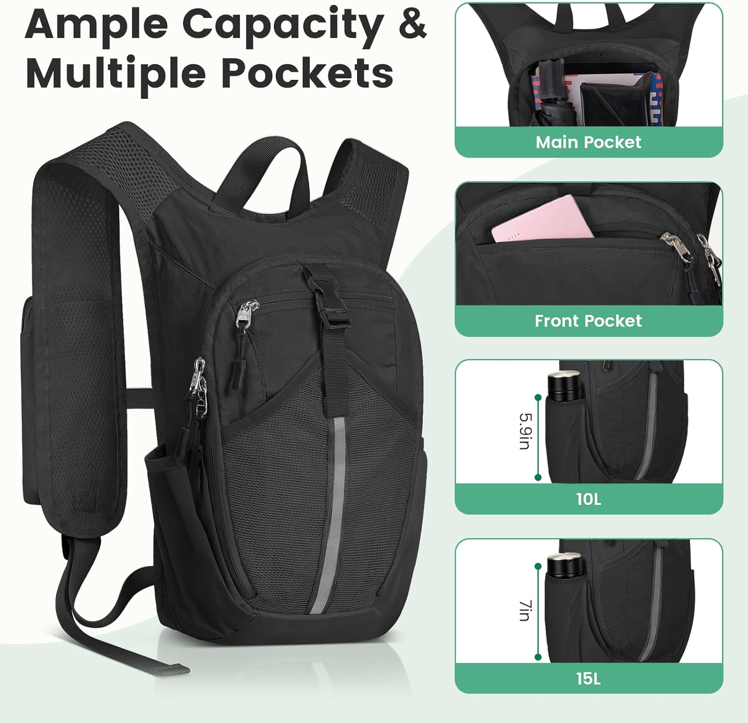MULTI-FUNCTIONAL COMPARTMENTS: Despite its compact 10L capacity, this backpack maximizes storage through smart compartmentalization. Beyond the main compartment, it features a front elastic mesh pocket for jackets or snacks; a front zippered pocket for keys and wallets; dual side pockets for water bottles; and a specially designed rear hidden anti-theft zippered pocket for valuables. Added reflective strips enhance safety during nighttime outings.