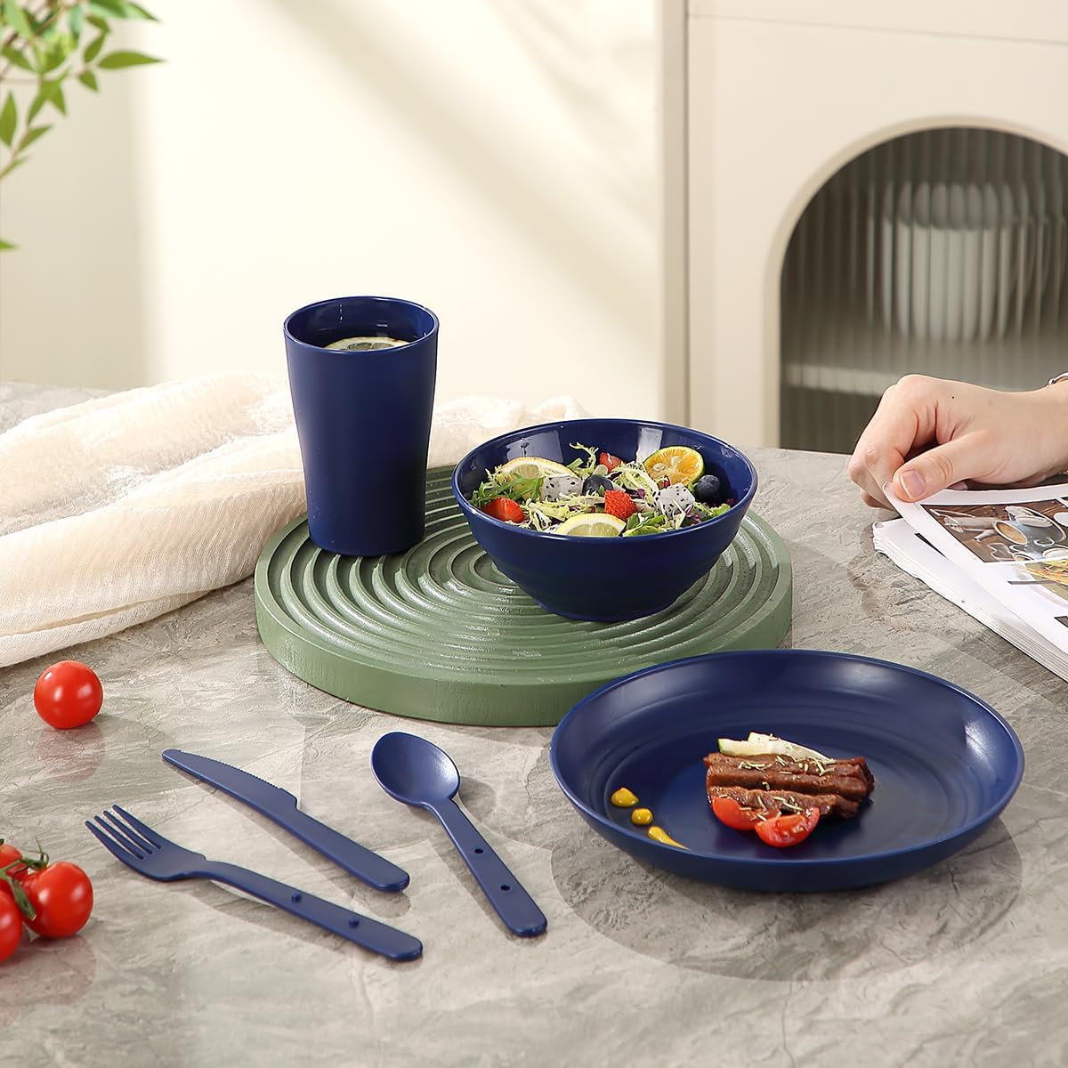 4. Dishwasher Safe and Easy to Clean: After a delicious meal in the great outdoors, cleaning up is a breeze. The entire kit is dishwasher safe, saving you time and effort. Simply toss the plates, cups, and utensils into the dishwasher for a quick and thorough clean, or wash them by hand with ease.