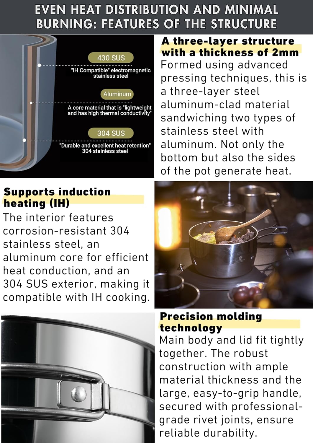 【Supports induction heating (IH)】The interior features corrosion-resistant 304 stainless steel, an aluminum core for efficient heat conduction, and an 304 SUS exterior, making it compatible with IH cooking.