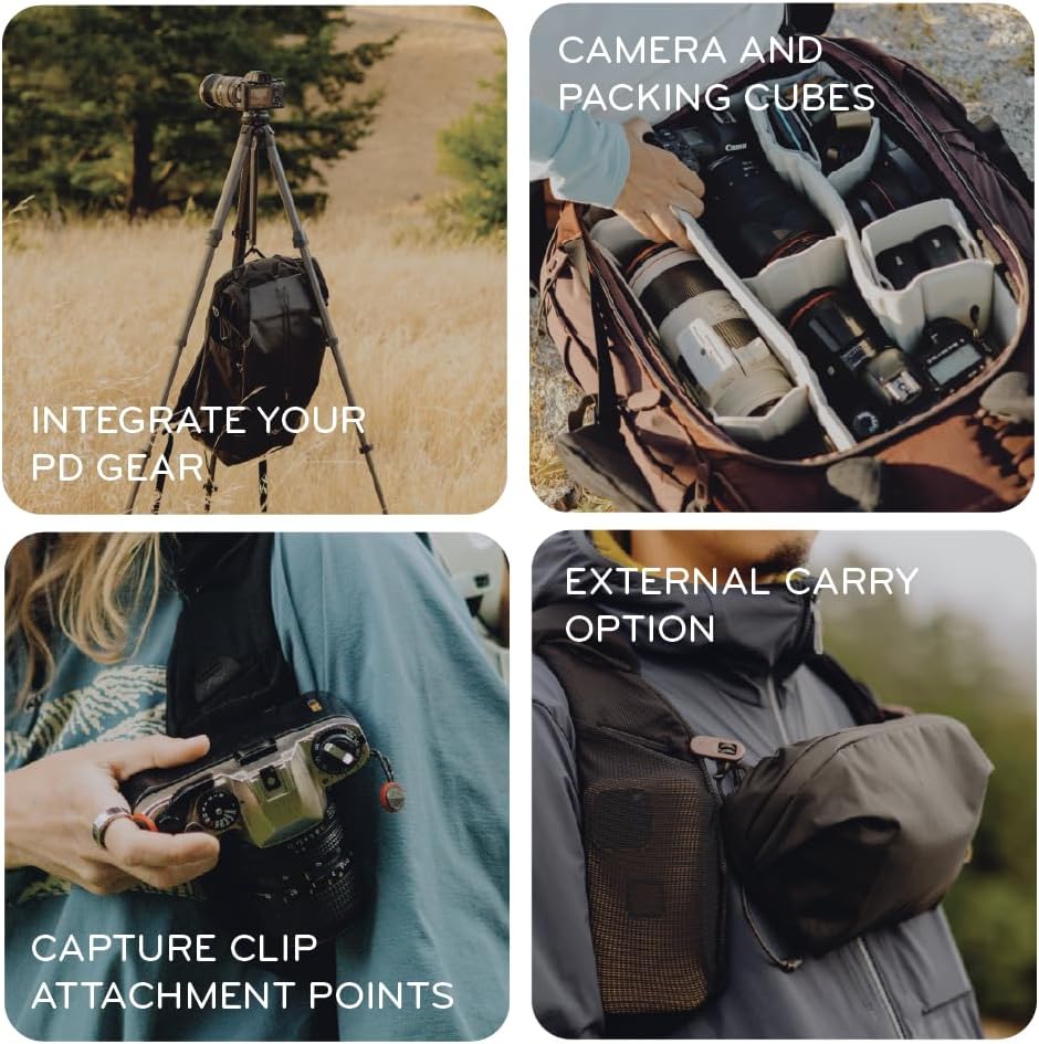 Fitment: Fits torso sizes from 17-20″ (43-50cm) | Fits waist sizes from 24-52″ (61-132cm) External Dimensions Roll-top down: 48.5cm x 28cm x 15cm (19.09″ x 11.02″ x 5.91″) | Roll-top extended: 66cm x 28cm x 15cm (25.98″ x 11.02″ x 5.91″) Internal Dimensions Roll-top down: 48cm x 27.5cm x 14.5cm (18.90″ x 10.83″ x 5.71″) | Roll-top extended: 65.5cm x 27.5cm x 14.5cm (25.79″ x 10.83″ x 5.71″) Capacity Roll-top down: 20L | Roll-top extended: 25L PD Camera Cube Capacity Fits 1x Smedium Camera Cube, with option to place X-Small Camera Cube above it Not compatible with Small, Medium, or Large sizes Hydration/Laptop Carry 1x internal hydtration sleeve, 1x external hydration sleeve (center Flex Pocket) internal sleeve fits up to 16″ MacBook Pro Weight 1.15 kgs (2.54 lbs) Materials Exterior fabric is weatherproof and sustainable, Internal PU coating – exterior is hydrostatic, PFAS-free water-repellant treatment is a more sustainable option to standard DWR, Super-durable #8 and #5 weatherproof UltraZips, All cording made from ultra high-strength UHMWPE for extended durability, Blended nylon and UHMWPE stretch mesh pockets, Breathable nylon mesh harness and backpanel, Nylon Cord Hook and strap adjustment hardware, Custom aluminum hardware for harness and strap adjustment What’s In The Box? 1x Outdoor Backpack 25L, 2x Cord Hook Gear Loops, 2x Cord Hook External Carry Cords, 1x Key Tether, 2x Sternum straps, Note: Hip Belt sold separately