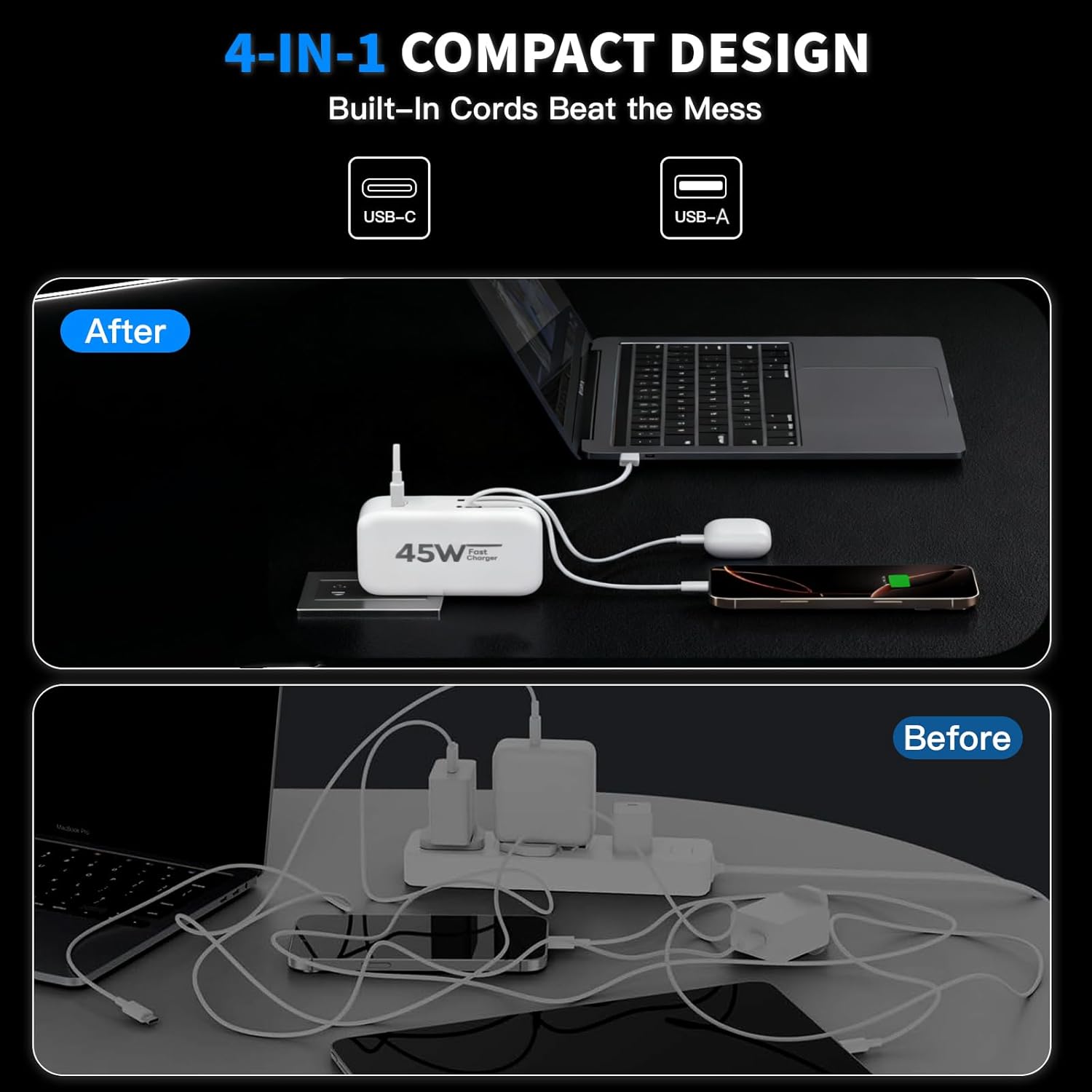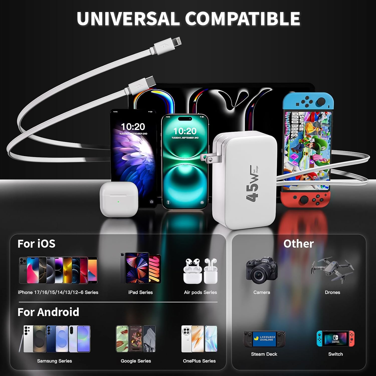 [4-in-1 45W Retractable Fast Charger]:This 45W 4 in 1 retractable wall charger for iPhone 17 features 1*18W QC USB-A port, 1* 20W PD USB-C port, plus 1*Type-C cable and 1*Lightning cable. As a practical retractable iphone charger wall plug, it can fully meet your daily charging needs to the greatest extent-charging up to 4 devices simultaneously with a total output power of up to 45W. It can charge your iPhone 17/16 to 60% in 30 minutes, making your life easier.