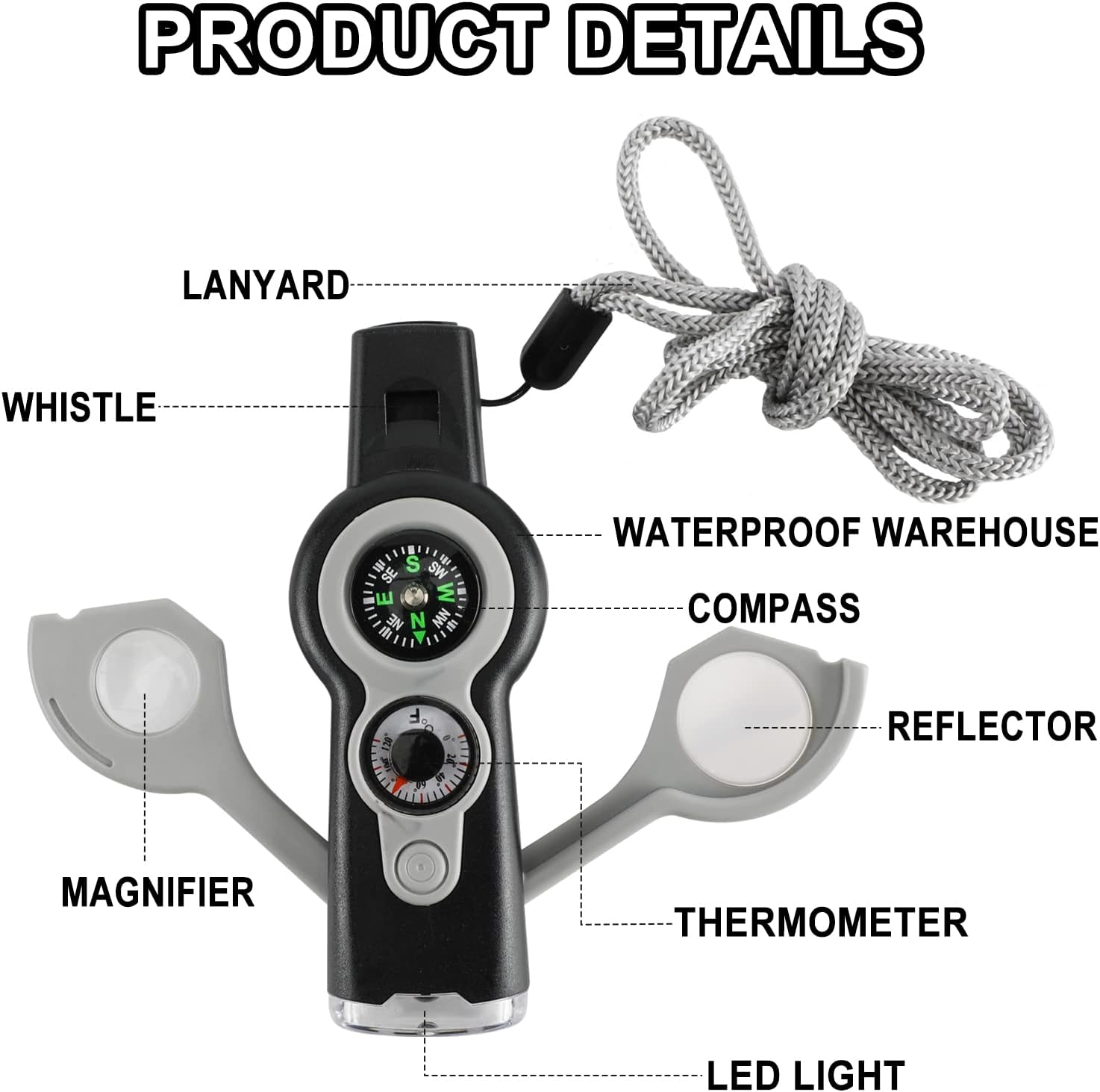 Unmatched Versatility: The 7-in-1 Safety Whistle sets 7 functions including Emergency Whistle, Compass, Thermometer, LED Signal Light, Magnifying Glass, Reflector and Sealed Warehouse with good playability (The uniquely designed miniature built-in storage bin can be used to store important personal information, allowing rescuers to grasp your situation at the first time) (NOTE: If you need help in an emergency, you can try whistling softly, which is louder than whistling at full force)