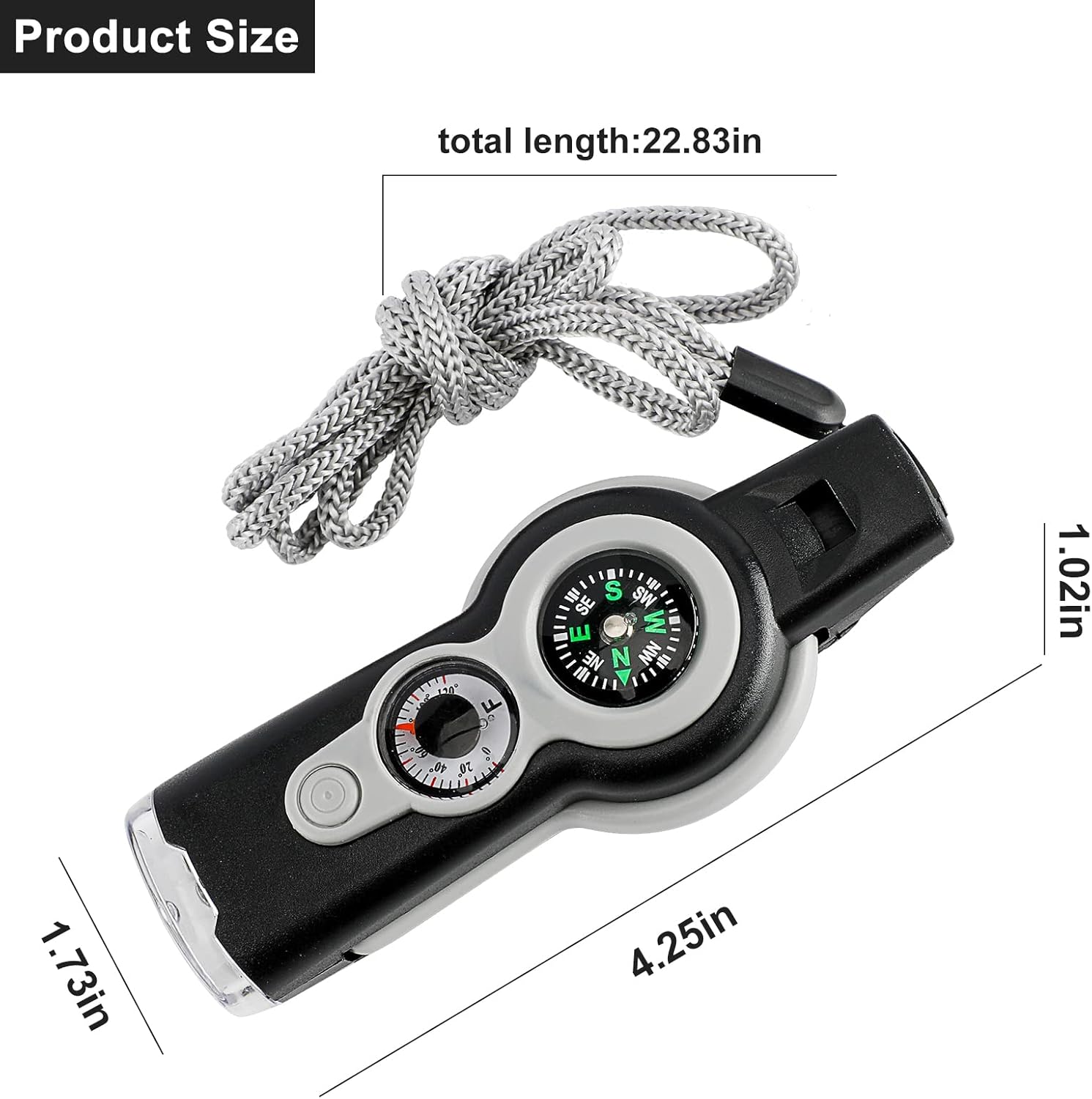 Unmatched Versatility: The 7-in-1 Safety Whistle sets 7 functions including Emergency Whistle, Compass, Thermometer, LED Signal Light, Magnifying Glass, Reflector and Sealed Warehouse with good playability (The uniquely designed miniature built-in storage bin can be used to store important personal information, allowing rescuers to grasp your situation at the first time) (NOTE: If you need help in an emergency, you can try whistling softly, which is louder than whistling at full force)
