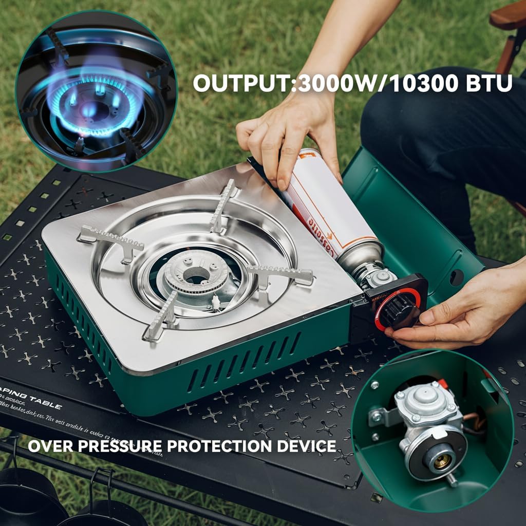 AUTO SHUT-OFF SAFETY FEATURES: Equipped with advanced safety features, including an In-Line Regulator with Pressure-Sensing Shut-Off, this Butane Stove ensures a secure cooking experience. The regulator automatically shuts off the flow if pressure becomes too high, enhancing safety during use.