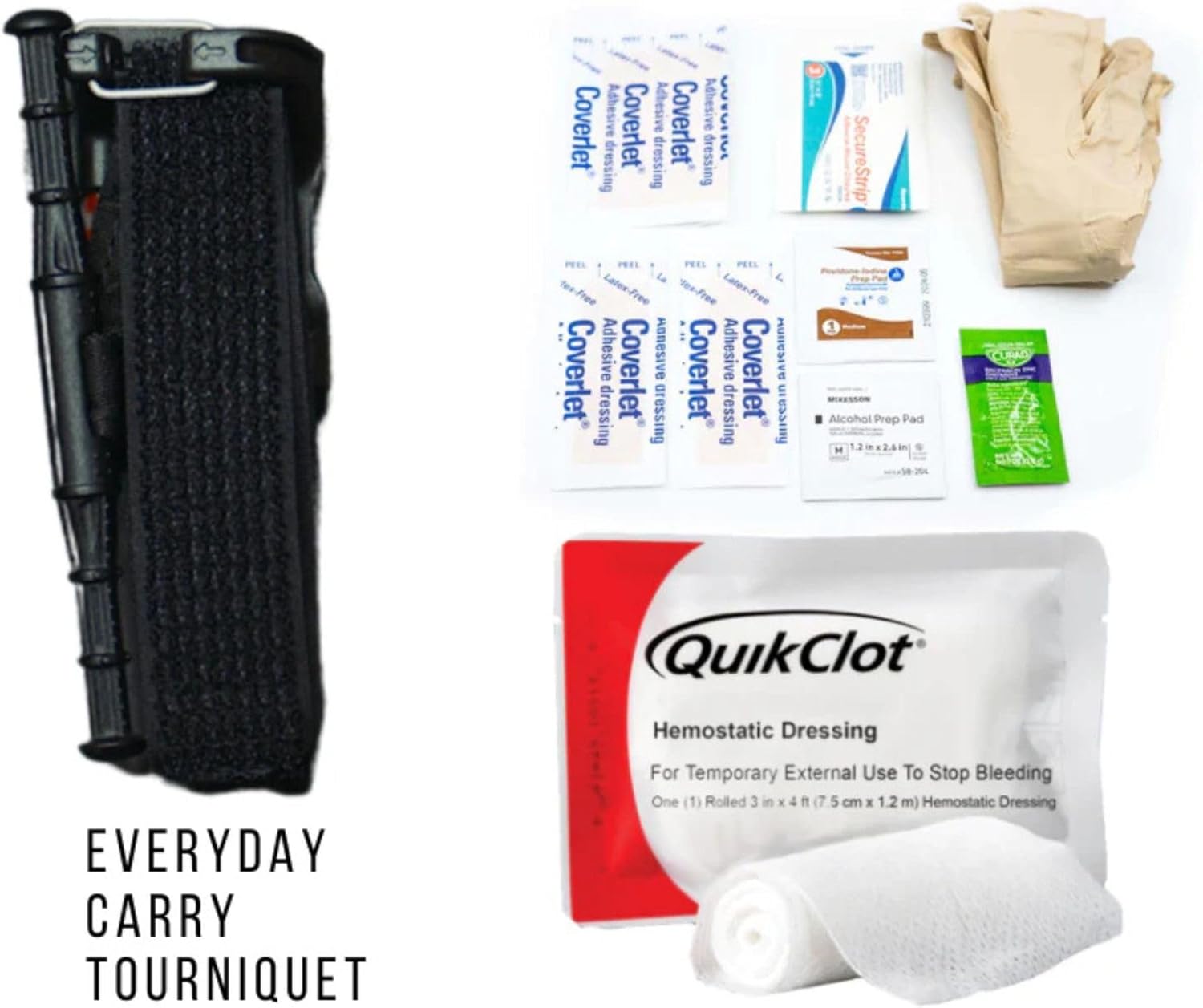 Includes: ETQ Tourniquet, Quikclot bleeding control dressing, nitrile gloves, and micro first aid kit with bandages.