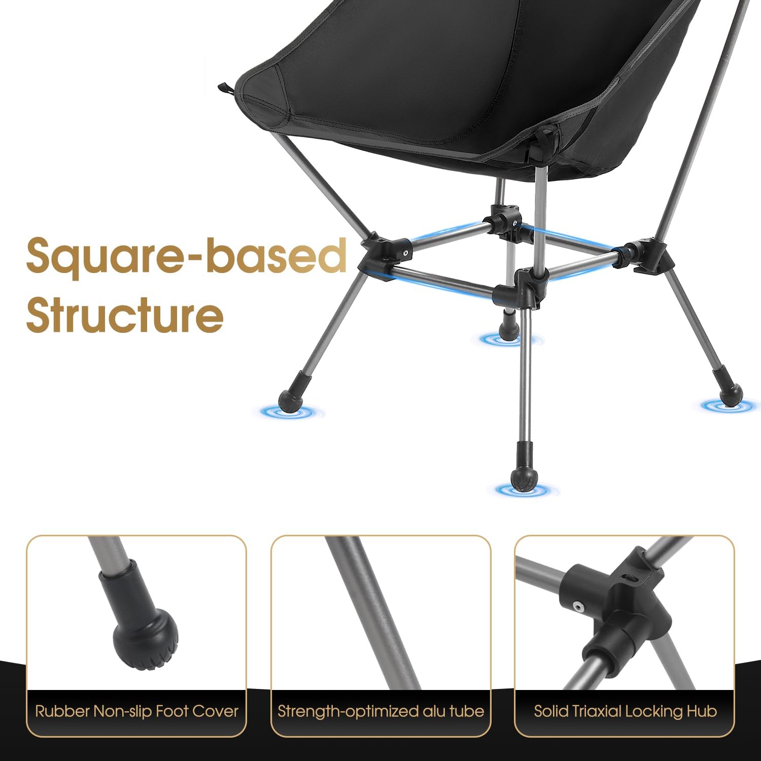 【Durable & All-Terrain Stability】: Built with high-strength aircraft-grade 7075 aluminum alloy, the chair offers an exceptional strength-to-weight ratio. A reinforced base and triple-lock joints provide stability on uneven ground, while 600D oxford fabric supports up to 330 lbs. Non-slip rubber feet ensure a secure grip on wet surfaces