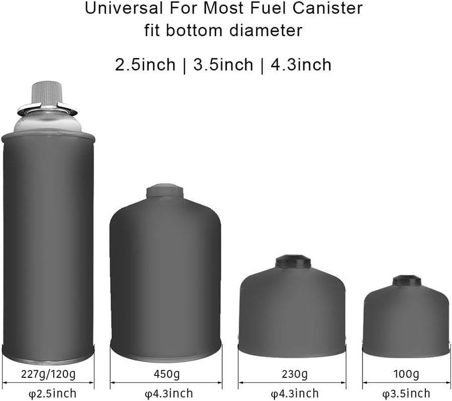 3 Fit Multiple Size Fuel Containers-it fit 2.5inch/3.5inch/4.3inch diameter fuel can, suitable for butane long can, tall can, cylinder can, It can be applied to most camping gas tanks sold on the market.