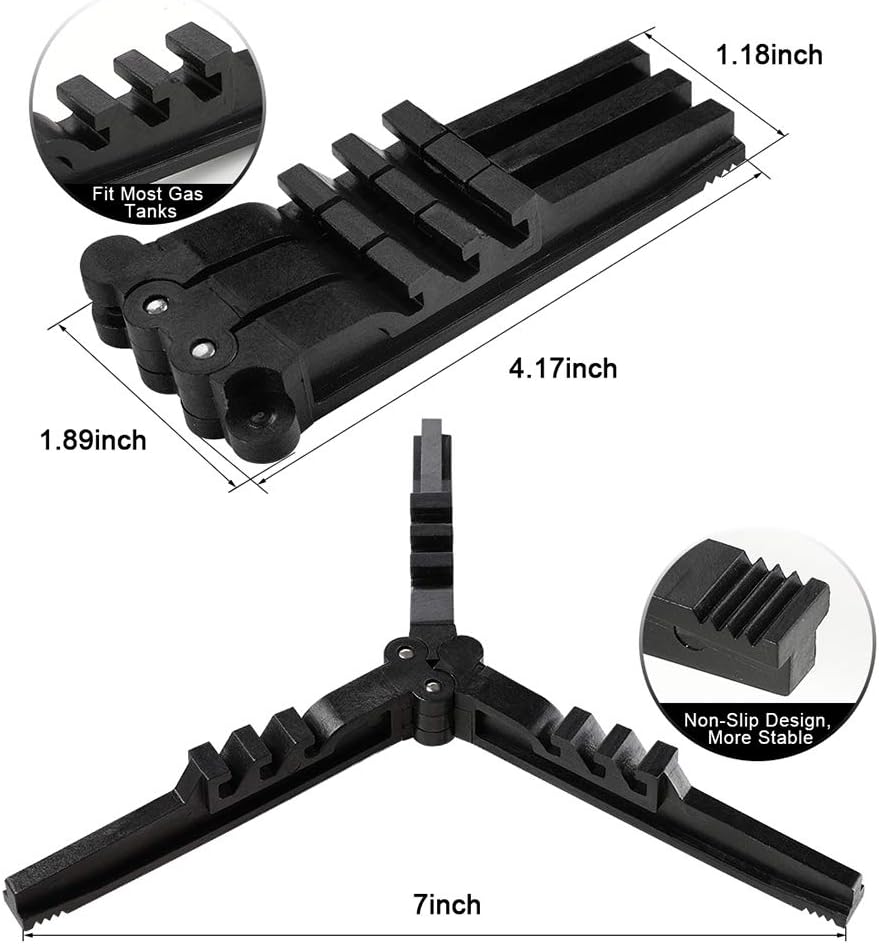 4 Solid And Sturdy Stabilizer-the gas tank stabilizer is made of strong plastic, making it sturdy. Easy to attach to the bottom edge of canister. The legs lock on a canister securely and tightly, keeping camping stove and fuel can canister upright.