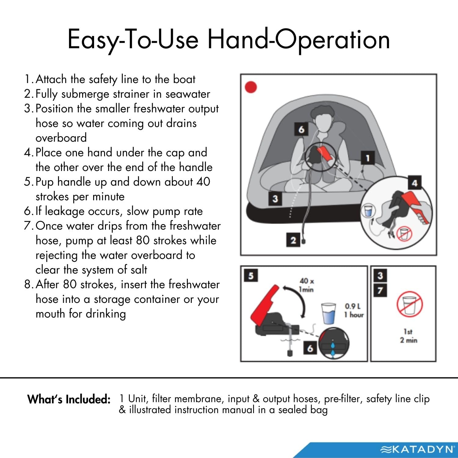 WORLD’S SMALLEST DESALINATOR: This hand-operated, compact, and lightweight Katadyn water desalination system is designed for emergency kits and life rafts for 1-6 people.