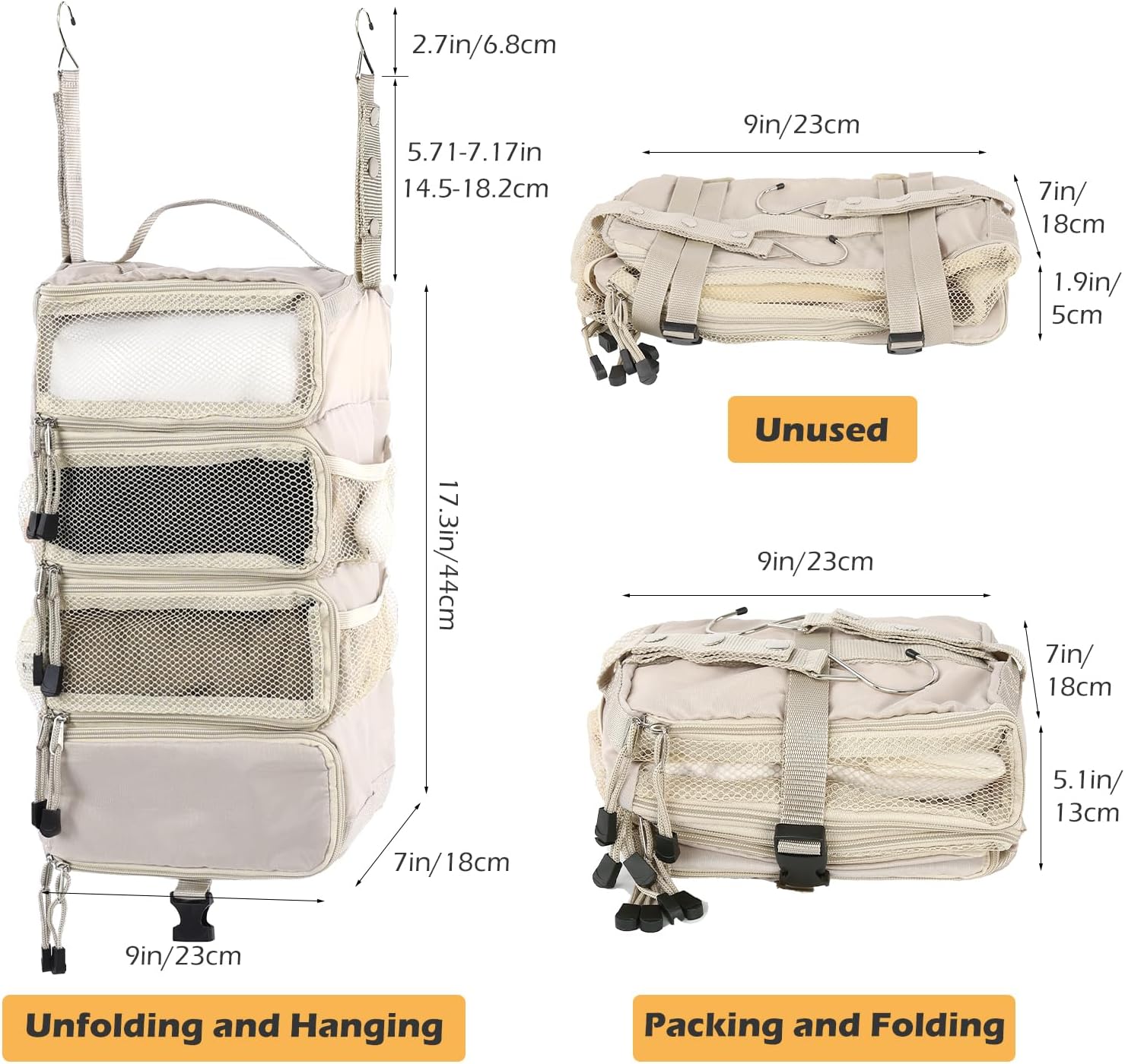 Innovative Folding Compression Design: When folded, our organizer compresses into a compact size, optimizing your storage space. You can pack more efficiently and have room for travel essentials. Even when folded, the individual compartments and mesh pockets remain intact, keeping your items separate and easily accessible.Folded (when not in use):9*7*1.9in(S);14.2*7.5*1.9in(M);Unfolded:9*7*17.3in(S);14.2*7.5*21.3in(M)
