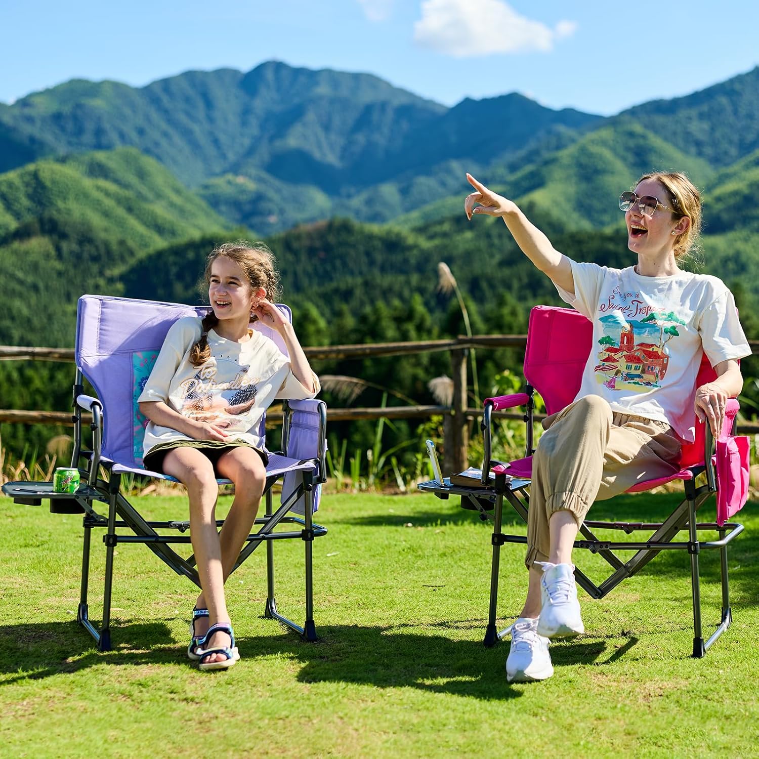【MULTI-STORAGE POCKETS】: The side table of our folding camp chair is equipped with an attached cup holders, phone slot and multi-functional side pocket, bring your essentials close to you while camping.