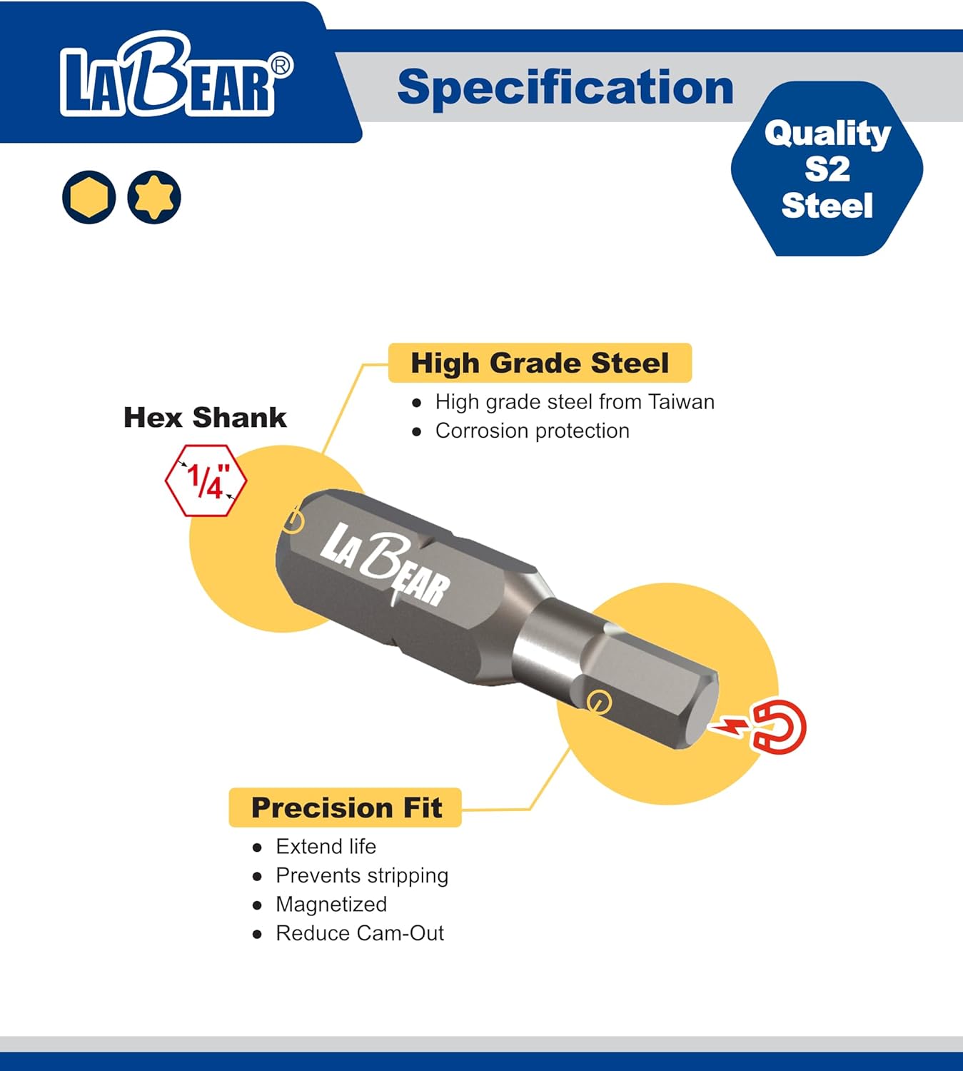 Includes 5 Essential Bits | Durable & Versatile Comes with five S2 steel 25mm bits—Hex H4, H5, H6; Torx T25, T30—covering common needs for home projects, bikes, cars, and electronics. Fully compatible with all standard 1/4 inch hex bits.