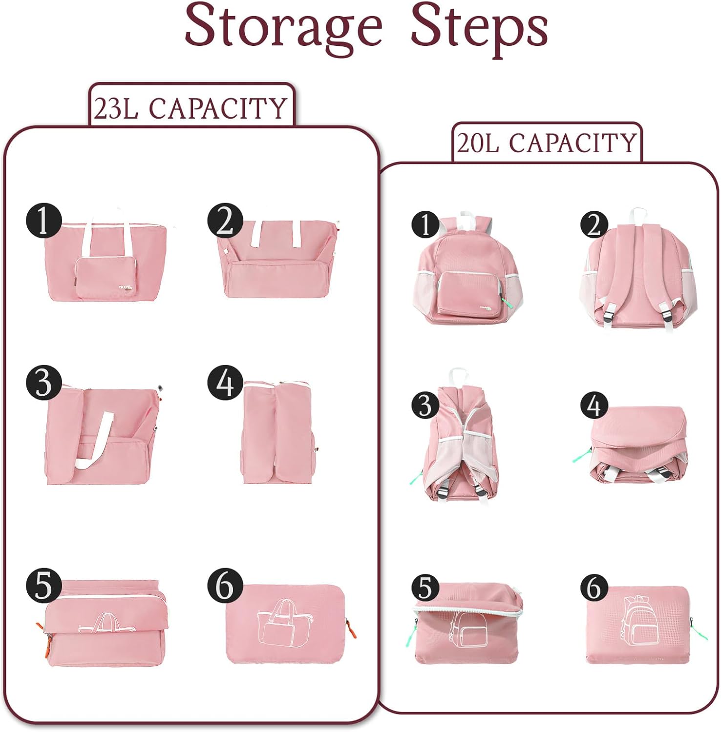20L capacity & 23L capacity meets all your daily requirements and travel needs carries all essential gears,You can pack clothes, books, magazines, documents, cell phones, keys, laptops, glasses,bottle,toiletries.The multi-functional carry on bag helps you organize and store your items easily