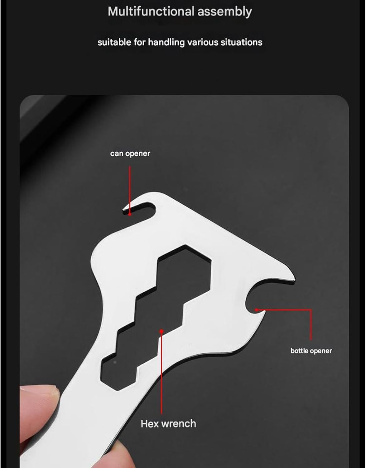 Its ergonomic handle ensures slip grip during bottle opening or screw tightening tasks, while hanging hole allows easy attachment to backpacks, keychains, or camping gear.