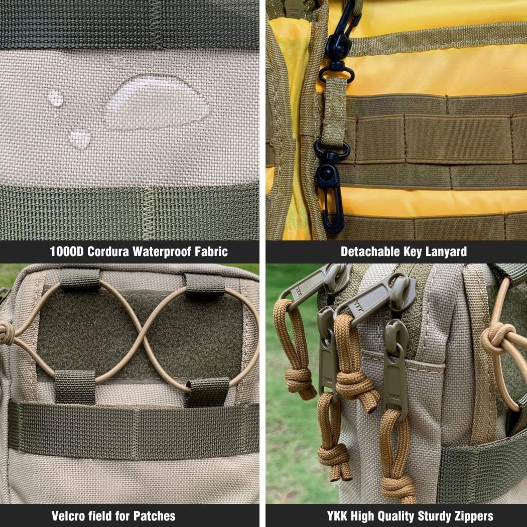 This tactical pouch has two layers pockets with YKK zippers.Easy access front slip pocket, total 18 elastic webbing slots and and 6 flat pockets, and 3 mesh bags . Detachable Key Lanyard. In the front zipper pocket, you can hold your flashlight, pen, key, small notebook, knife or other edc items in there, and the back zipper pocket it’s perfect for your power bank, Charging cable, Smart earphone and etc.