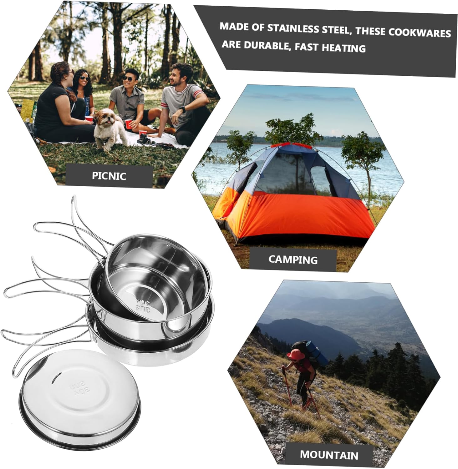 picnic cookware Camping cookware is so portable that you can take out with you and cook some food or tea anytime and anywhere.camp cookware Lightweight and , for camping backpacking, hiking, picnic and other outdoor activities.stainless steel camping pot This item is a camping cookware for outdoor which is made of stainless steel materials for and long time use