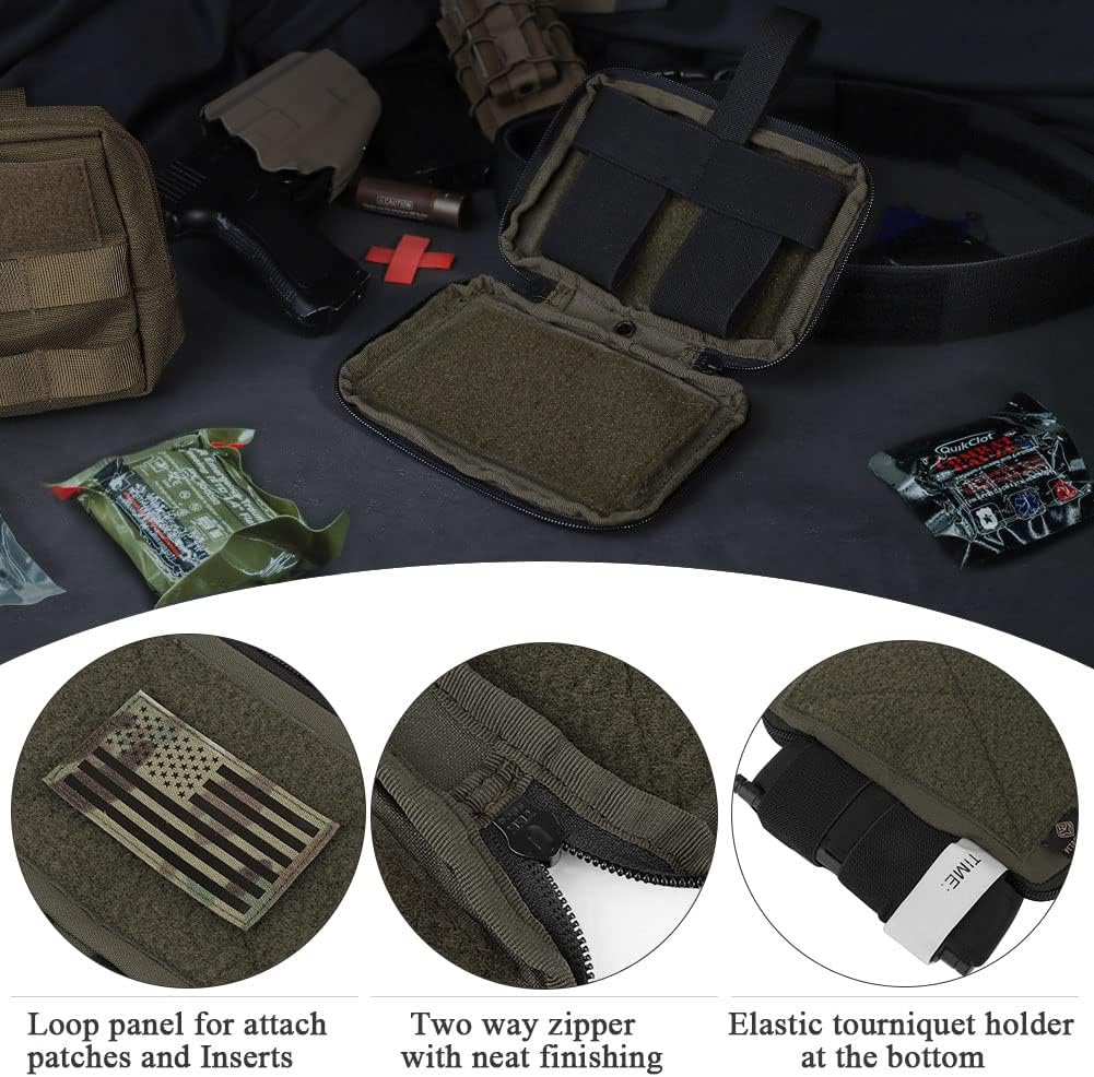 Constructed with 500D Nylon. Two way YKK zipper. Front loop panel for attach patches or small object lined with hook. Tourniquet holder placed at the bottom of pouch and attached via elastic loops. Inside the pouch is a removable elastic tray holding the gear. Unzip the pouch on one side with either hand, grab the tray pull handle, and you’re good to go.