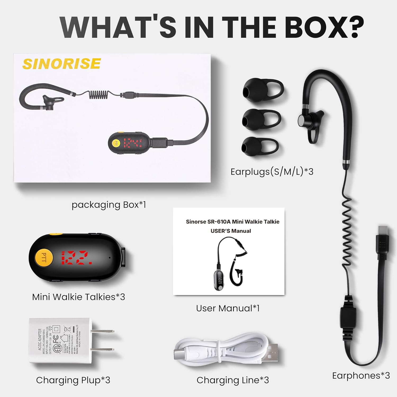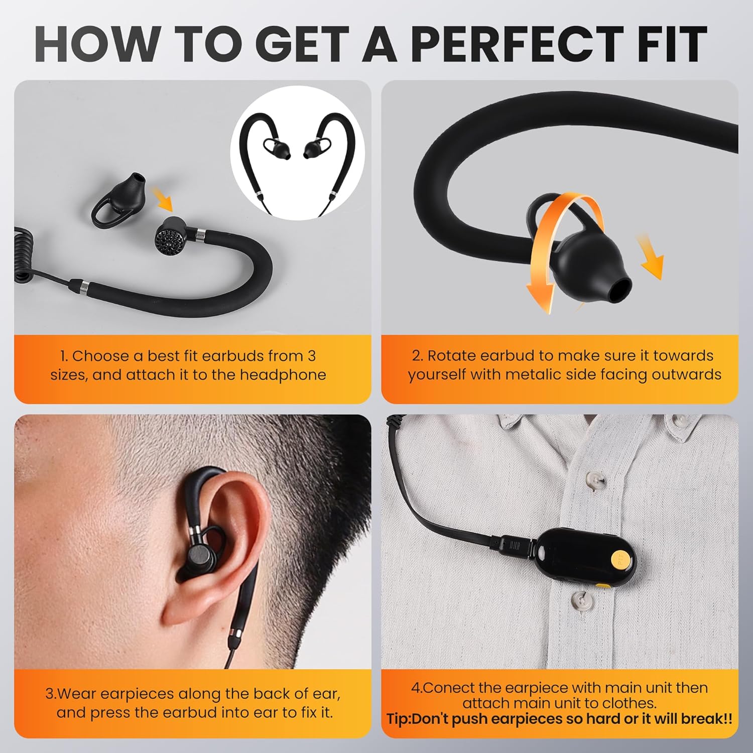【Mini & Lightweight Two-Way Walkie Talkies】Ultra-compact size (2 × 0.84 × 0.59 inches) and only 0.6 oz, easy to carry anywhere. Ergonomic G-shaped ear hook with soft, skin-friendly material fits closely to your ear for all-day comfort. Features a secure clip for attaching to collars or uniforms. 360° rotating headset works for left or right ear and includes 3 sizes of ear tips for a customized fit.