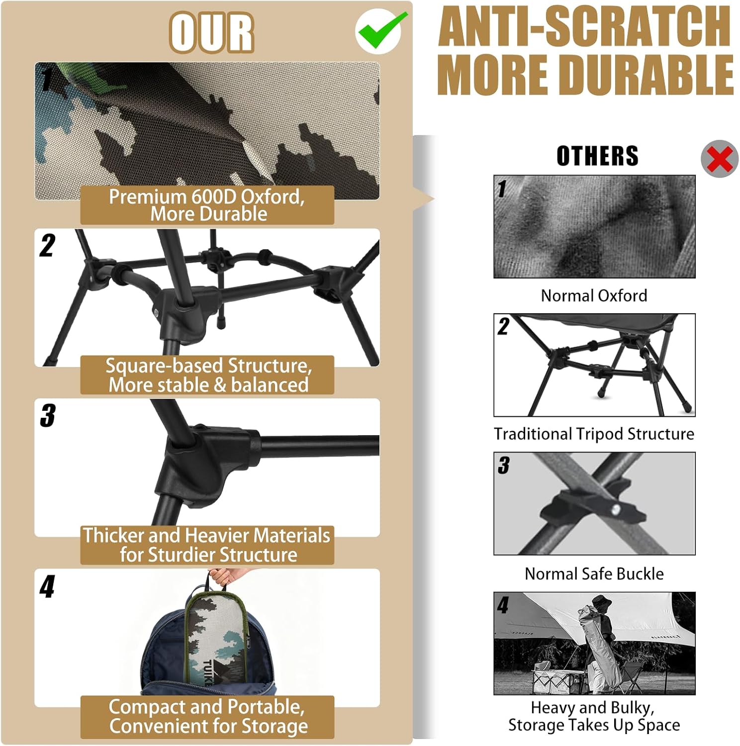【ULTIMATE COMFORT & STABILITY】Our square-base camping chair ensures even weight distribution for stable, wobble-free support. Unlike triangle frames, it eliminates pressure points, delivering unmatched comfort on any terrain. Built with 7075 aluminum to hold 265 lbs.