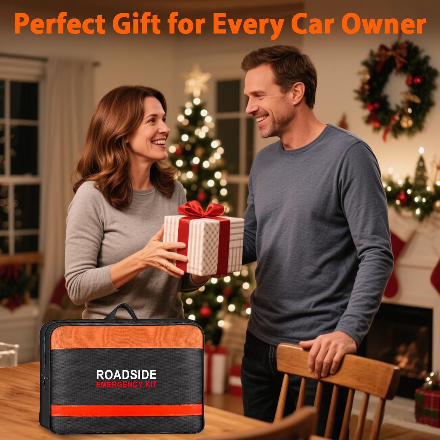 Professional Car Emergency Kits for Vehicles: It protect your family and your car for some unforeseen events. This emergency car kit for vehicles is specifically designed and curated by 5 survival experts, contains 150 PSI air compress , 8.2FT 500AMP Jumper Cables, Folding Shovel, Car Repair Tool Set, First Aid Kit, Emergency Blanket, Tow Rope, rain poncho, reflective warning triangle, reflective Safty Vest, space blanket, glass breaker, seatbelt cutter, safety gloves, electrical tape