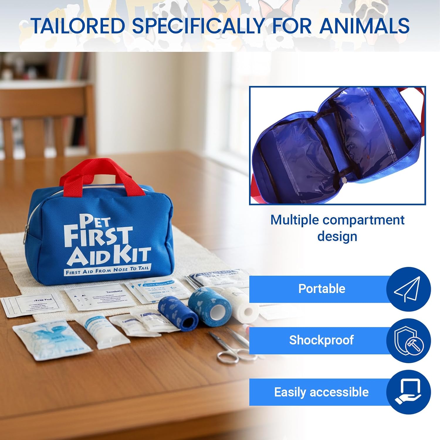 Tailored specifically for animals. Includes pet-safe tools and materials. Can be used by pet owners, veterinarians, groomers, or animal shelters for first-response care.
