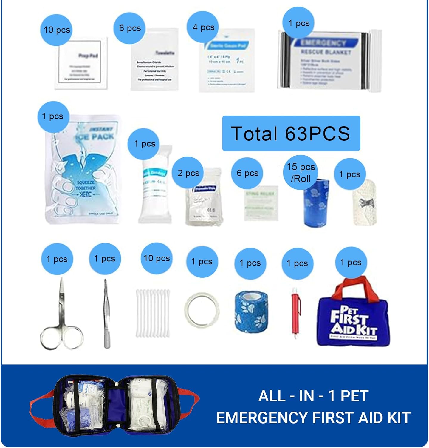 Includes 63 essential items such as bandages, scissors, tweezers, gauze pads, emergency blanket, feeding blow and more. Everything you need to treat minor injuries, bites, or scrapes for dogs, cats, and small animals.