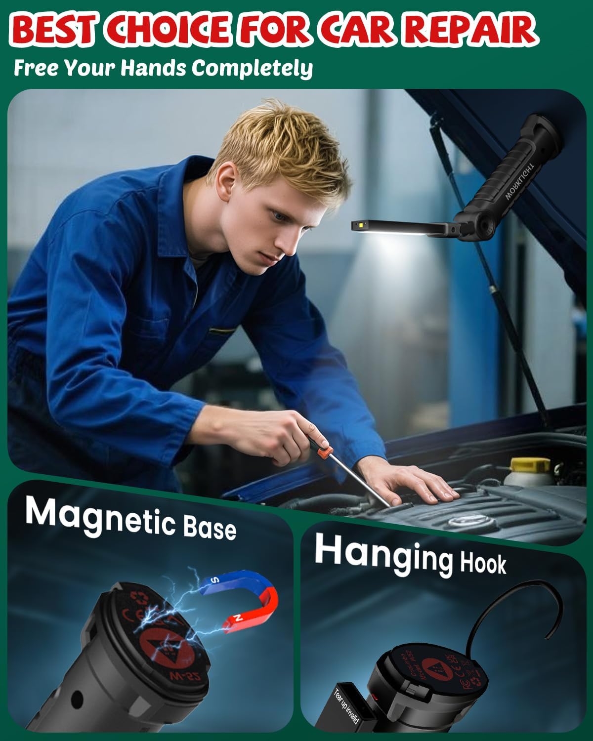 360 Degree Rotation, Magnet Base Hook: The magnetic light provide multi-angle illumination to meet your different lighting needs; Magnet base and hook make your hands free to do other things on the night. It can be aslo used for BBQ, camping, reading, car or truck repair and any other things you would want to do at night