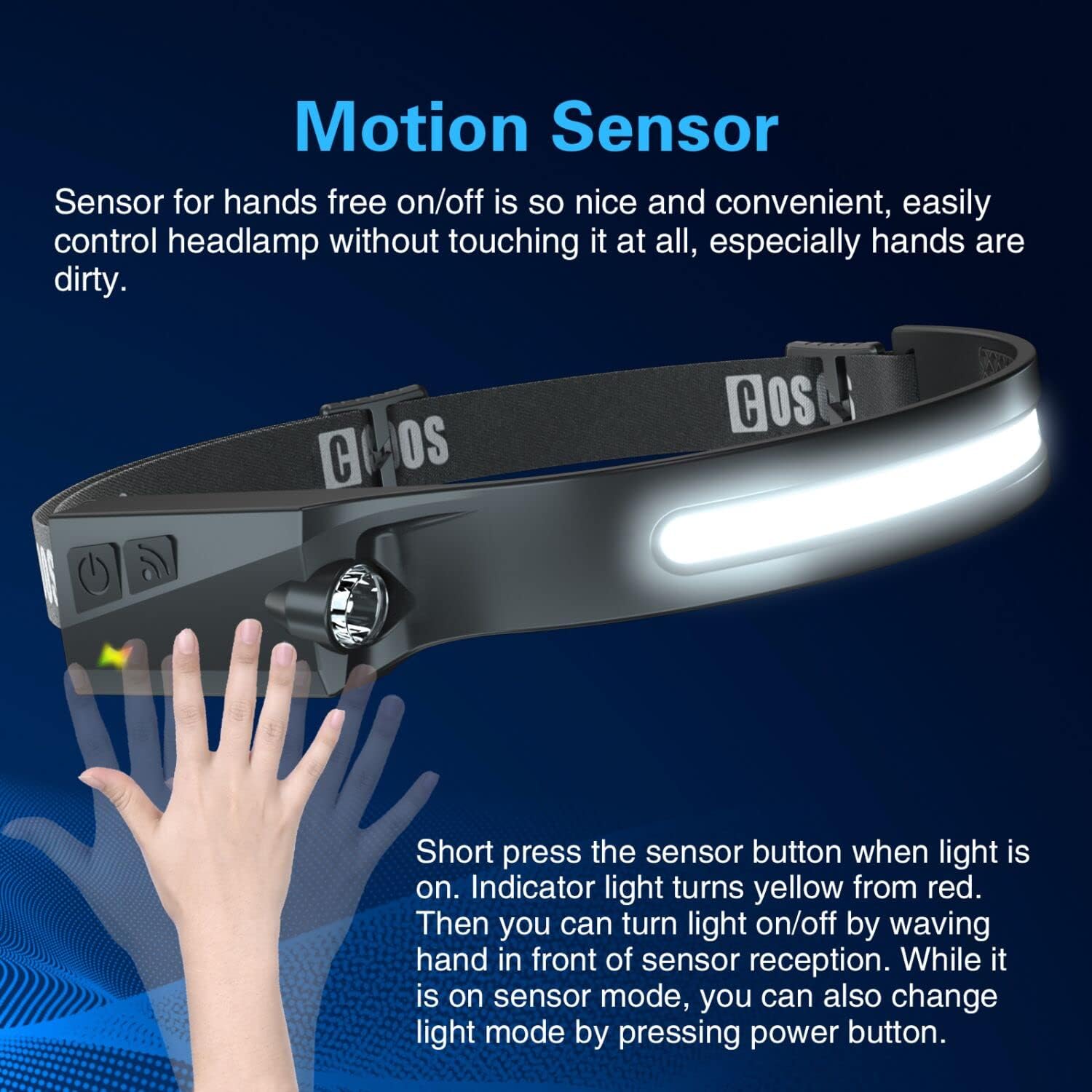 Motion Detection Technology, Hand-Free Light: Save tons of extra battery. COSOOS wide angle headlamp has built-in 1200 mAh lithium battery and please charge it by included usb c charging cable before use. Choose 1 of brightness settings, short press sensor button and set it as motion detection (Indicator light turns yellow from red.) Then you can turn light on/off by waving hand in front of sensor reception