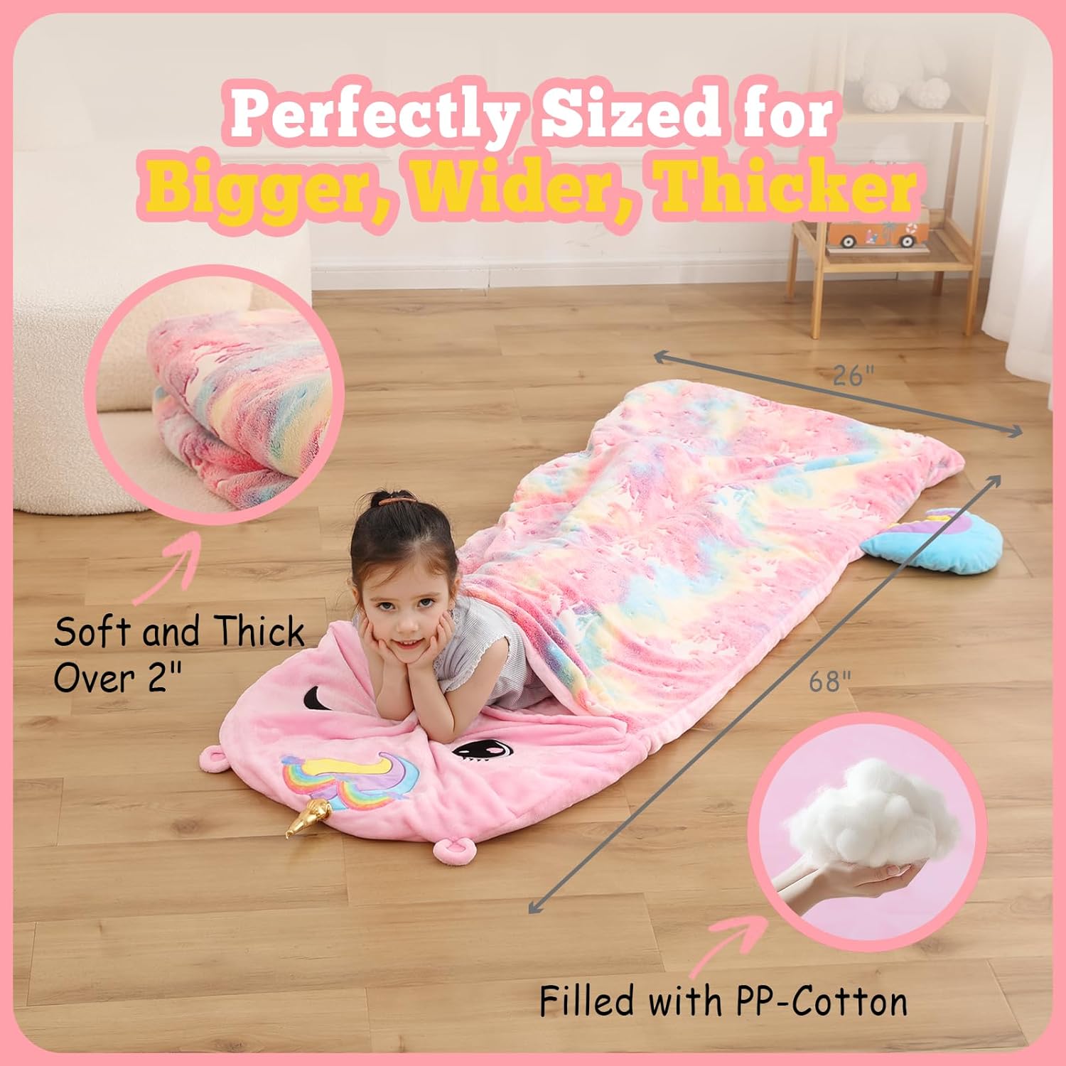 Perfect Size & Multifunctional: The unicorn sleeping bag measures 68″x26″x2″, which is extra-large, wide, and thick. This large kids sleeping bag is ideal for children aged 3 to 12. Can be used for play, sleeping, as a pillow, or for cozy companionship during movies and reading