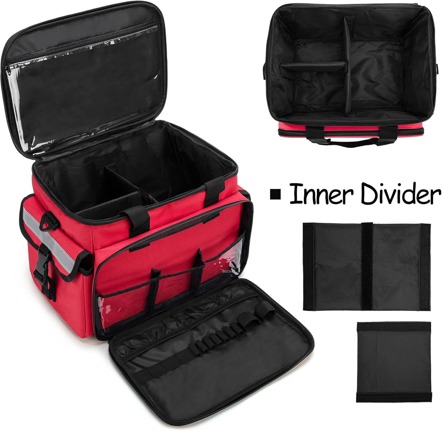 MAIN COMPARTMENT: 2 detachable dividers separate the main compartment into 3 parts for storage of first aid supplies, like bandage, tourniquet, sharp disposal container etc..Top transparent zippered pocket for easily viewing items inside.(BAG ONLY)