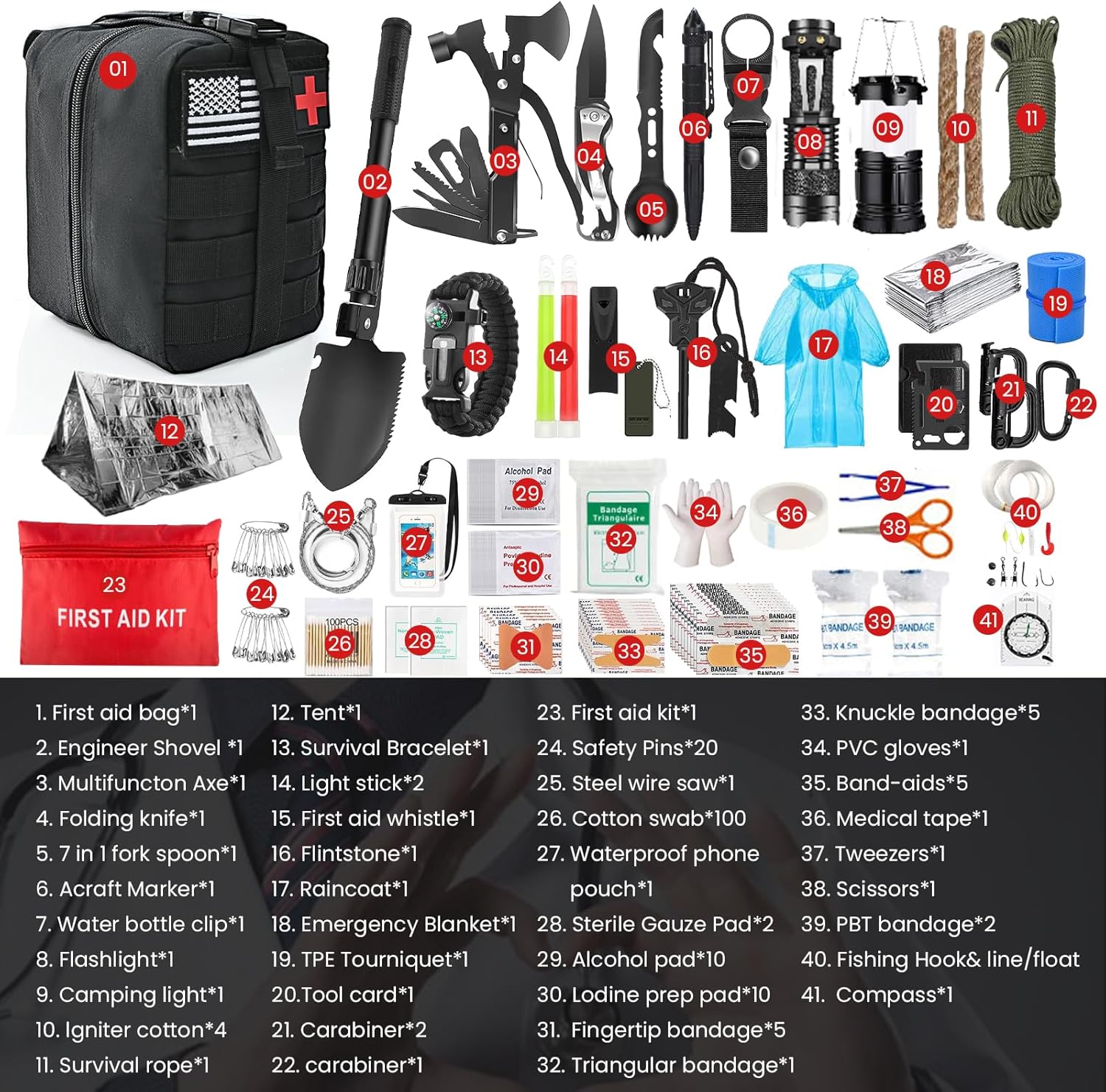 [Abundant Accessories]: The accessories in the first aid kit survival are divided into camping gears and first aid supplies. The two accessories are combined in one bag, which can be applied to emergencies such as hiking, camping, hunting,fishing, mountain climbing, rock climbing, and earthquakes. The comprehensiveness of this emergency survival kit is beyond your imagination. Accessories is reusable.