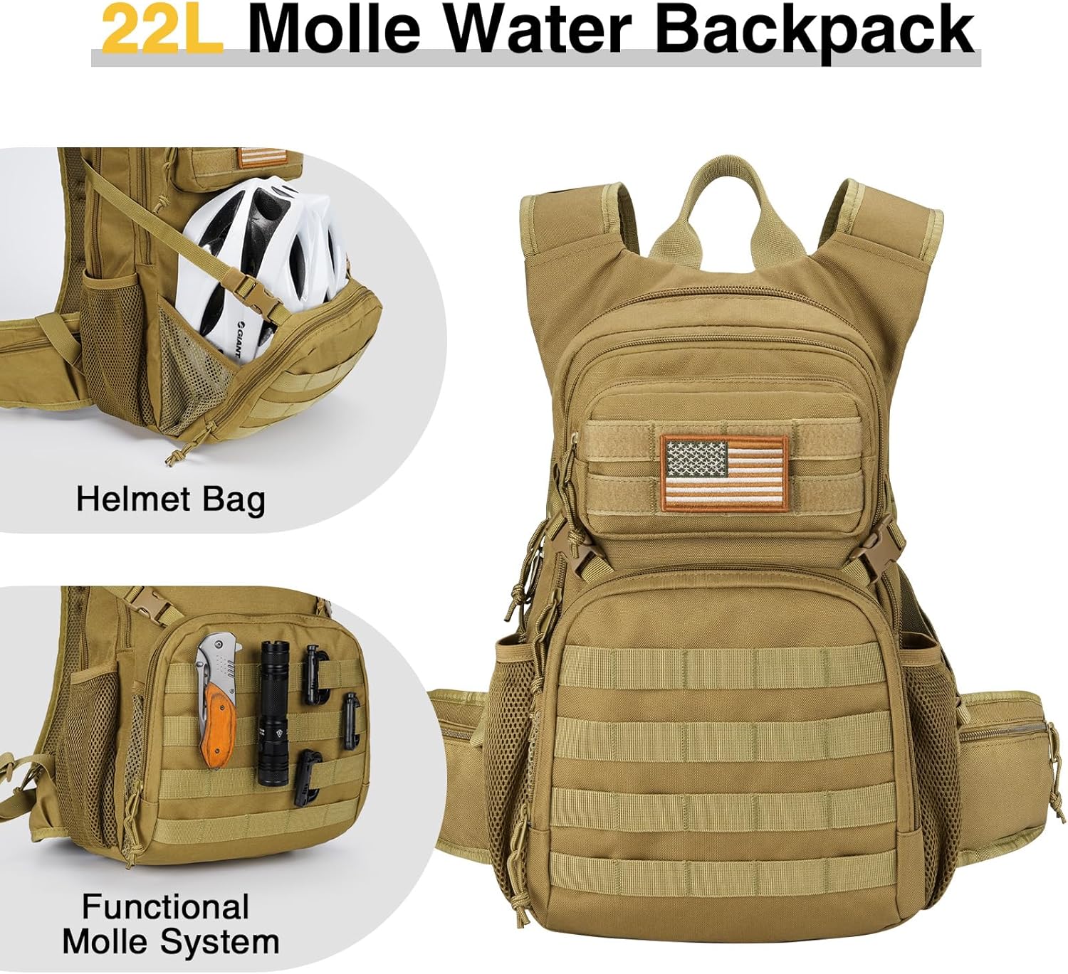 22L Capacity and High-Density Fabric: This tactical hydration backpack measures 18.5 x 10.5 x 7 inches and offers a generous 22L capacity. The sandwich layer between the outer and middle compartments provides expanded storage space, giving you ample room for all your essentials. Constructed from 900D x 600D PVC heavy duty material, the pack boasts excellent tear and wear resistance, ready to meet the demands of any outdoor adventure.