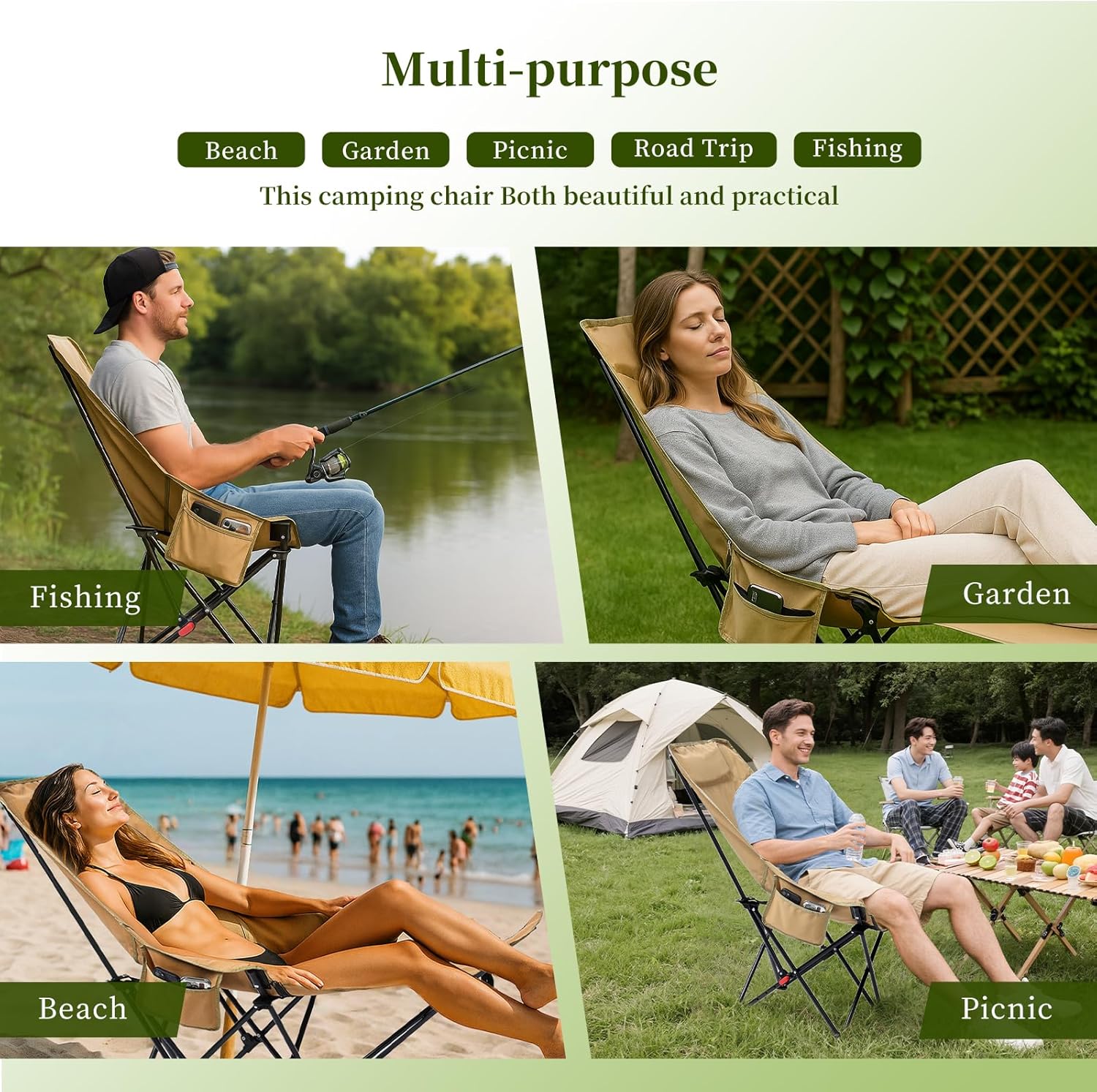 【Multi-purpose】: The camping chair is designed to be attractive and practical, and can meet the needs of a variety of outdoor activities such as beaches, gardens, picnics, road trips, fishing, and even as an office or garden nap chair.
