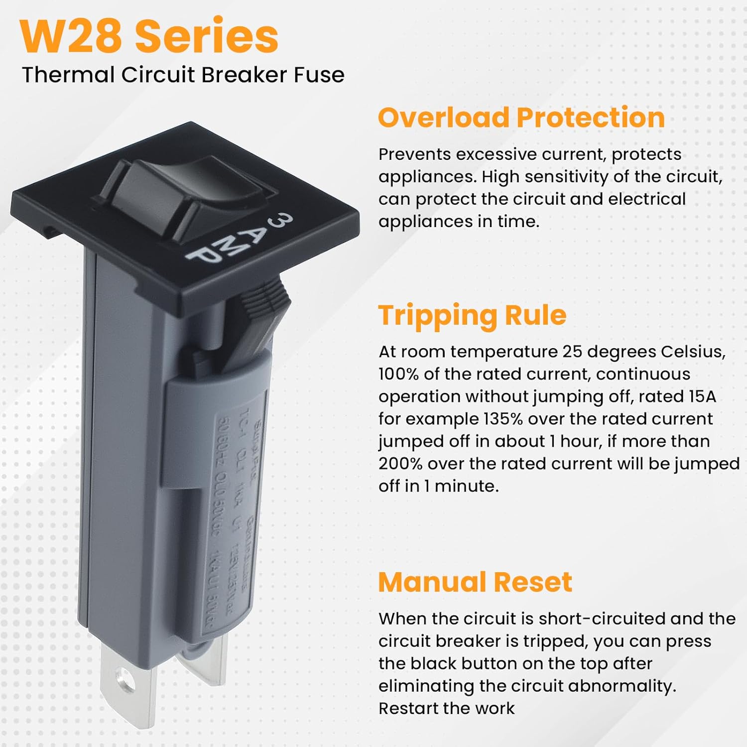 ๐๐๐ฌ๐ฒ ๐ญ๐จ ๐๐ฉ๐๐ซ๐๐ญ๐: The w type thermal circuit breaker features a snap-in installation method, allowing for quick and tool-free installation. After the circuit is tripped, simply press the top button to reset it, and the device can then be used normally