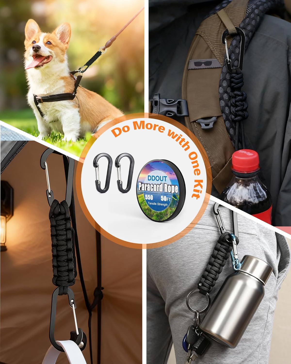 Packing List: Paracord Rope (50FT, Black) × 1, Carabiner Clip × 2, Cord Lock × 6